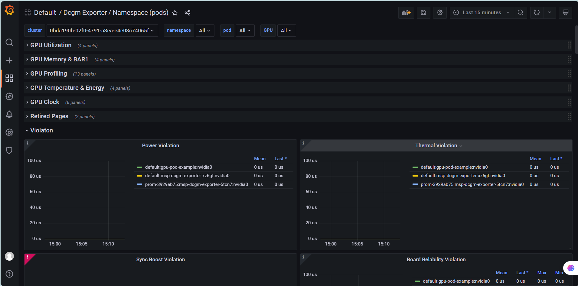 对于存量msp实例,原有Grafana中缺少Dcgm Exporter预置大盘。用户可以手动关闭Grafana后再次重新开启,方可正常查看Dcgm Exporter预置大盘。