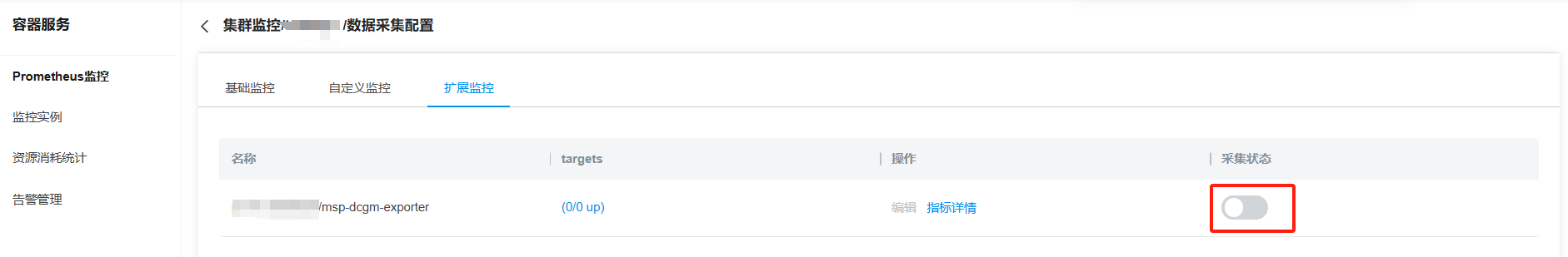 点击扩展监控页签,默认情况下msp-dcgm-exporter组件采集配置为关闭状态。开启采集状态,组件将自动安装至用户集群。