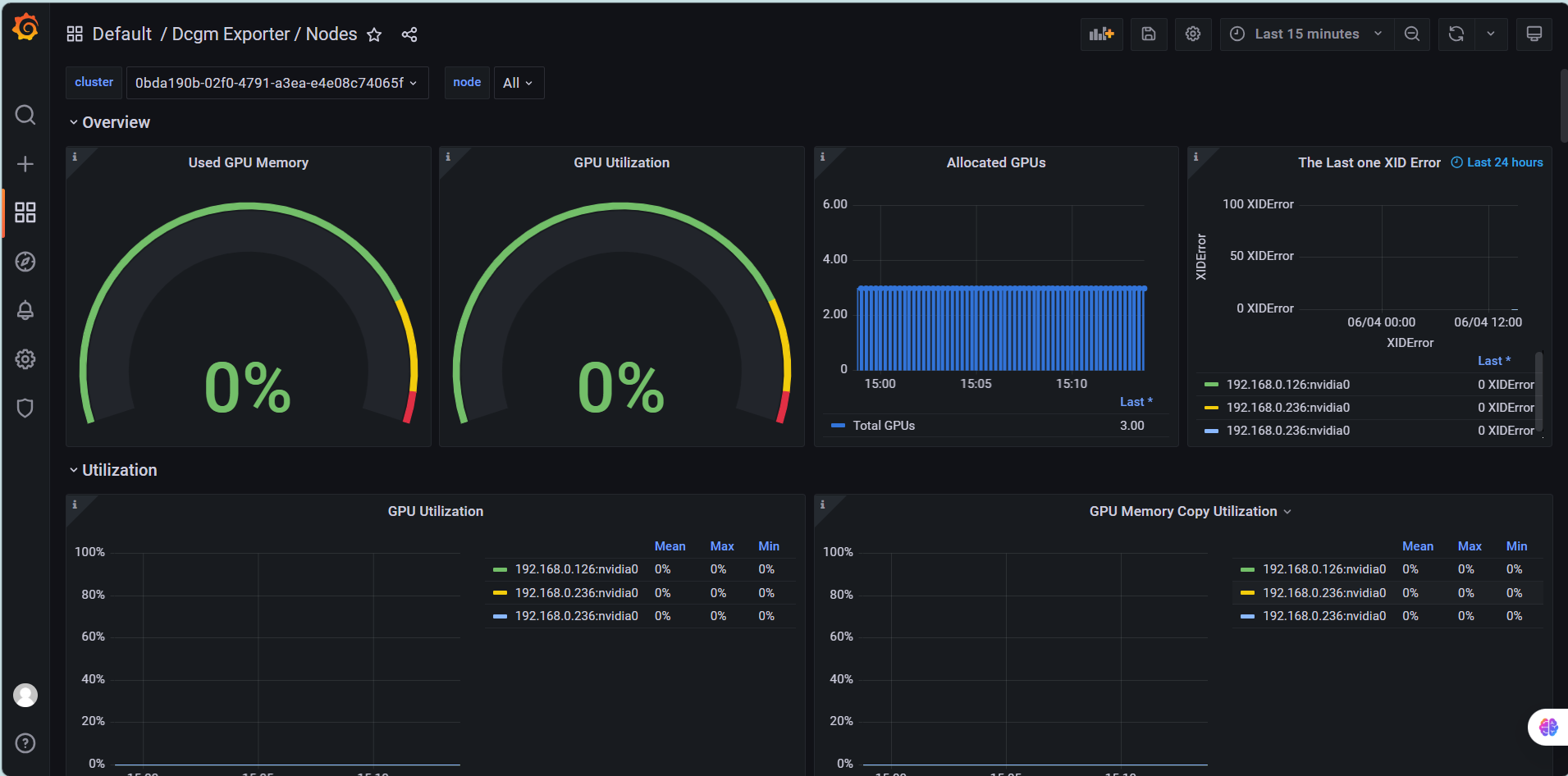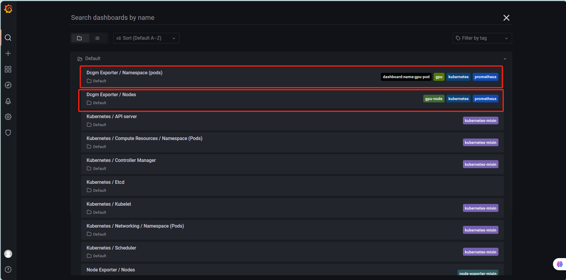 登录进入Grafana界面,分别从Node维度和Pod维度提供了Dcgm Exporter的预置大盘。