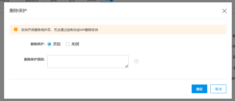 实例开启删除保护后,无法通过控制台或API删除实例,可减少误删除实例操作的情况发生。关闭删除保护后,方可通过控制台或API删除实例。
