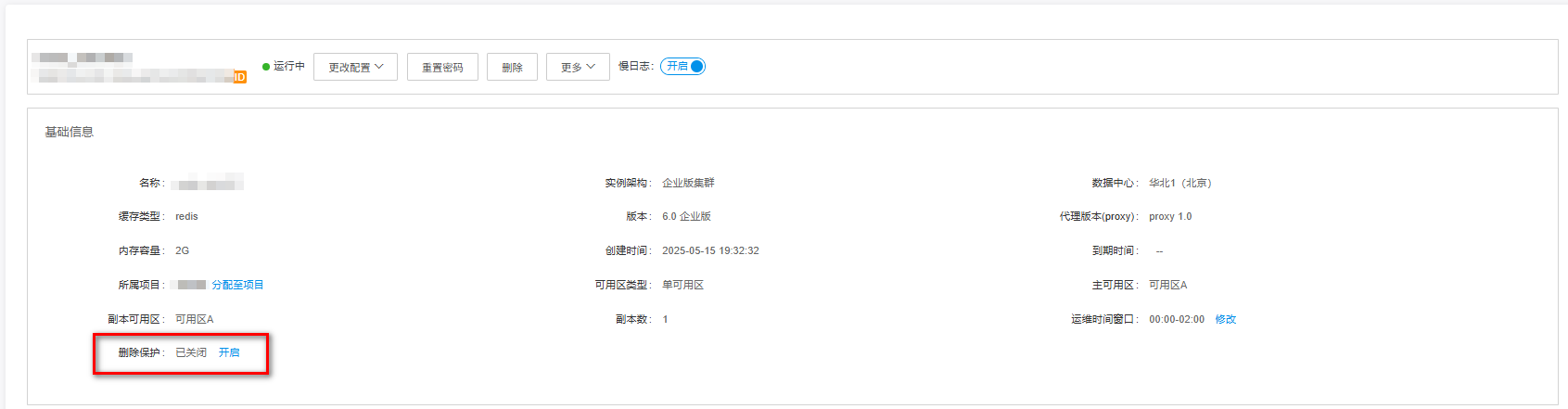 实例开启删除保护后,无法通过控制台或API删除实例,可减少误删除实例操作的情况发生。关闭删除保护后,方可通过控制台或API删除实例。