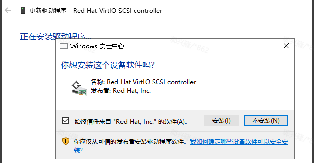 在安装驱动程序时,Windows会警告此驱动程序没有经过微软签名,此时点击“始终信任Red Hat,Inc的软件”,然后点击安装。