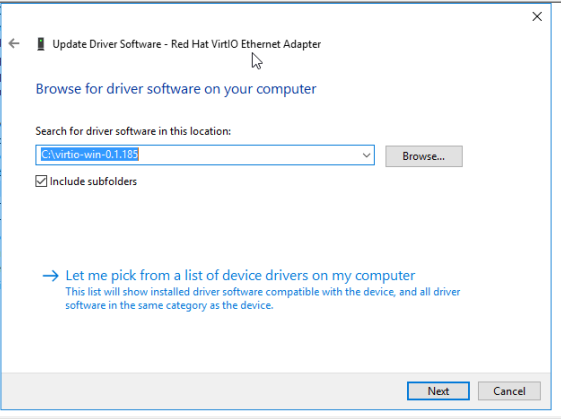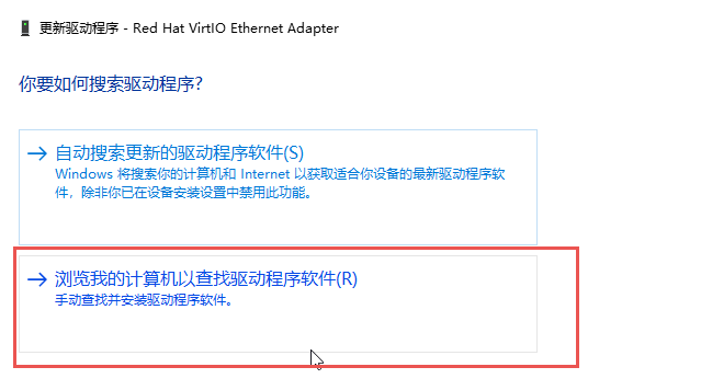 右键选择Red Hat VirtIO Ethernet Adapter设备,选择”更新驱动程序”,在弹出的对话栏中选择”浏览我的计算机以查找驱动程序软件”,