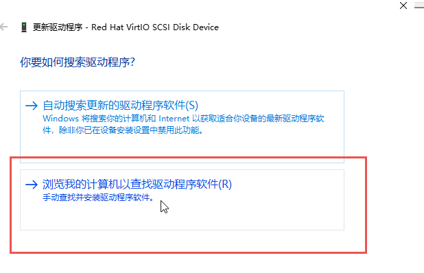右键选择Red Hat VirtIO SCSI controller设备,选择”更新驱动程序”,在弹出的对话栏中选择”浏览我的计算机以查找驱动程序软件”,