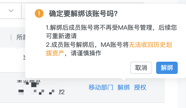 仅可解绑 邀请形式加入且财务模式为财务管理(非财务托管) 模式的成员账号,自建形式加入的成员账号或者财务模式=财务托管的成员账号均不支持解绑