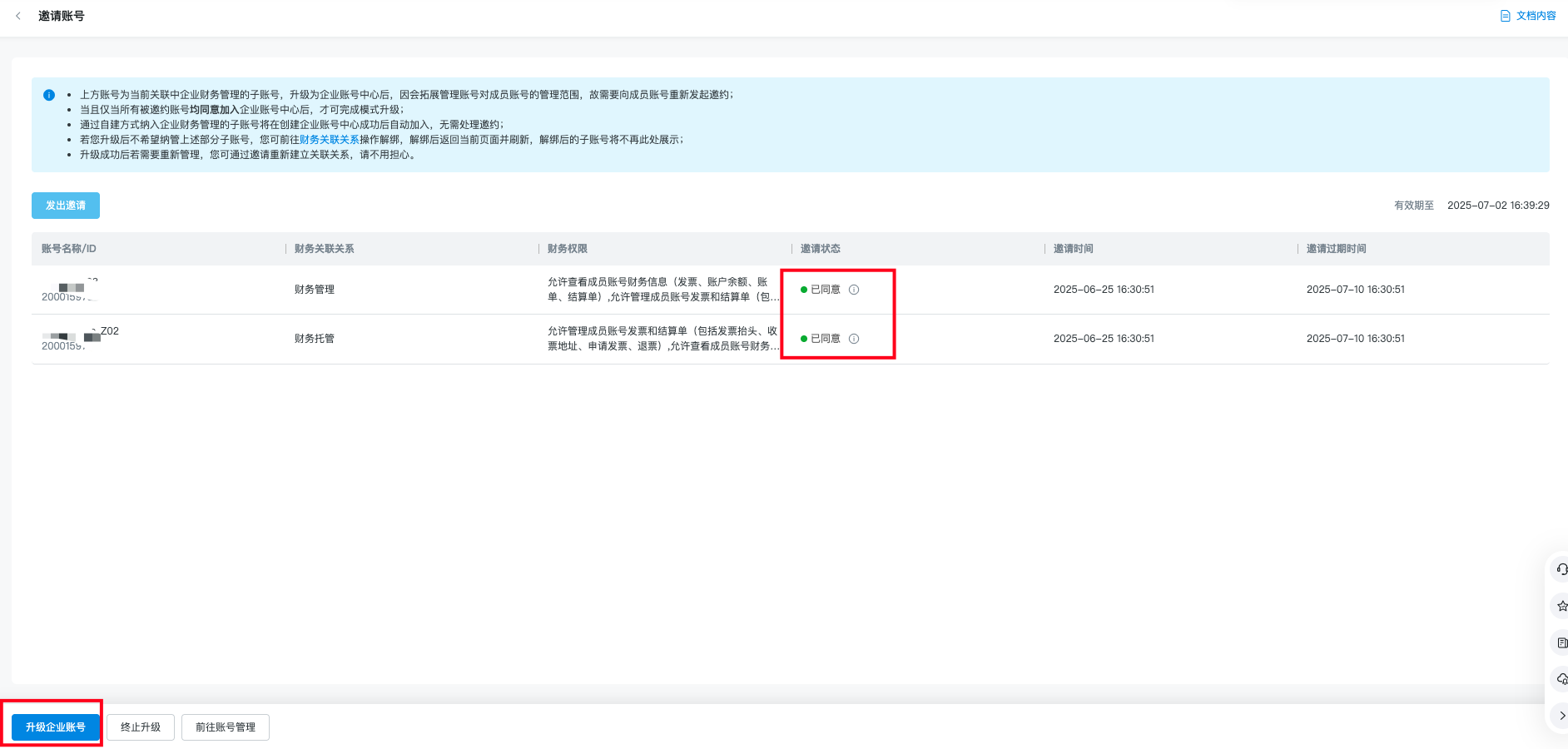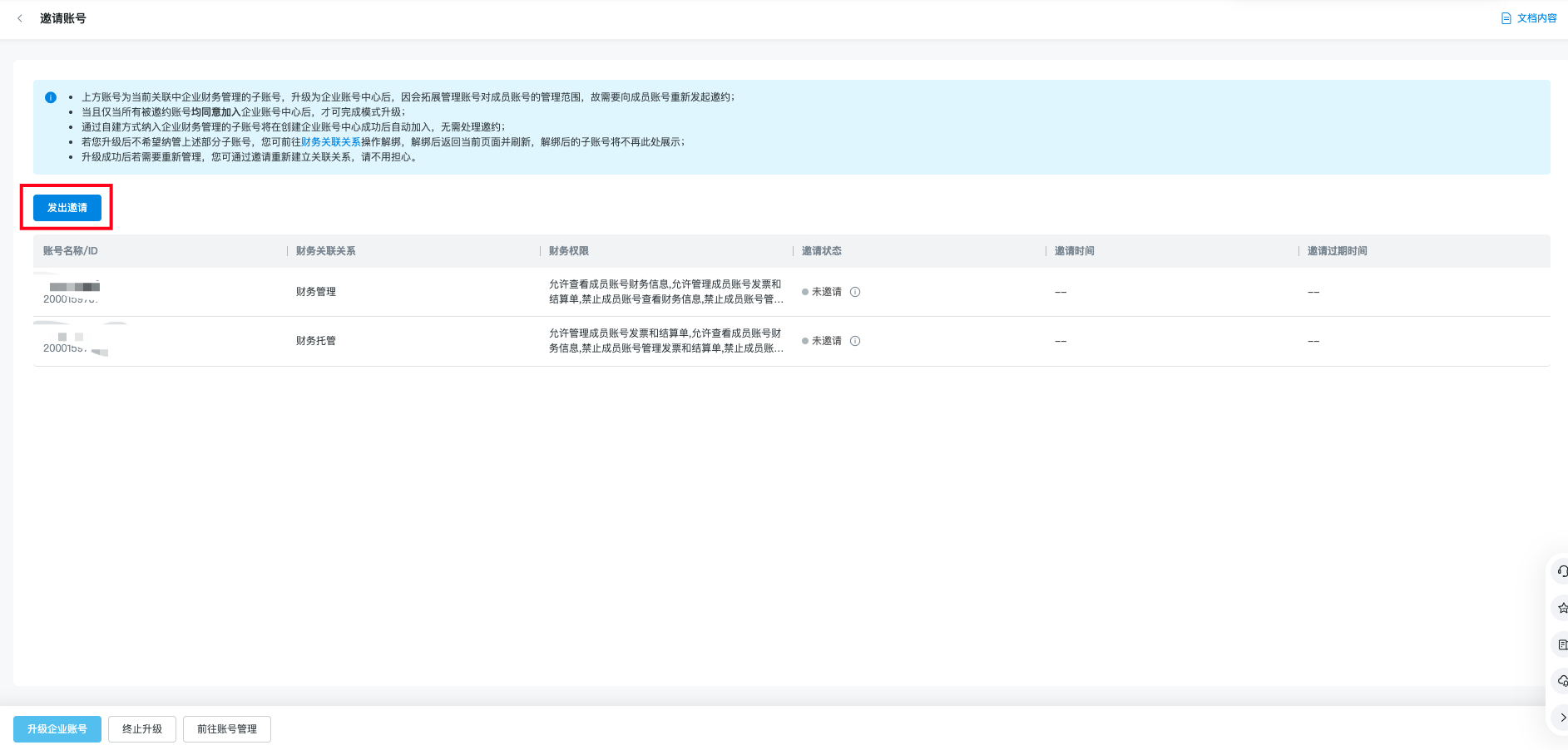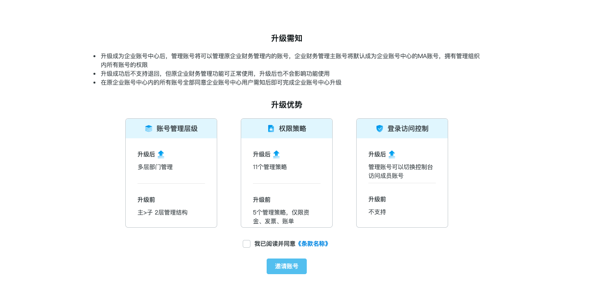 升级流程需要企业财务管理主账号和企业财务管理成员账号协同,主账号需要发起邀约,成员账号同意邀约