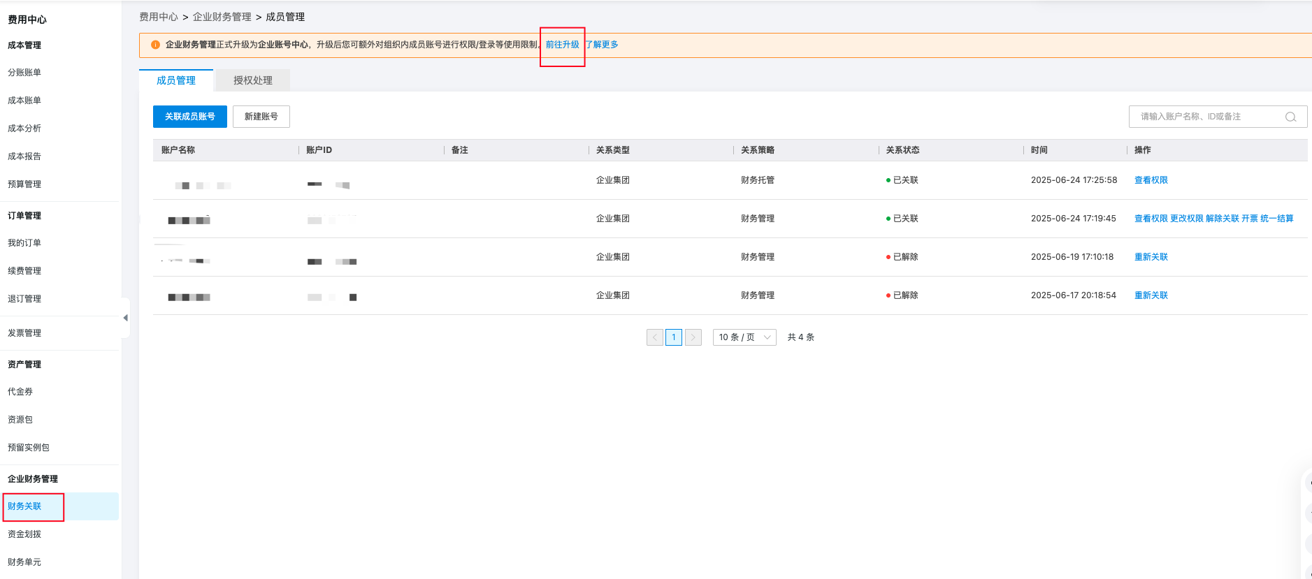 在原企业财务管理内的所有成员账号全部同意企业账号中心升级邀约后,即可完成企业账号中心升级