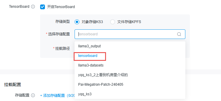Tensorboard存储配置与项目路径配置方式一致,开启Tensorboard后选择存放Tensorboard数据的存储配置即可。