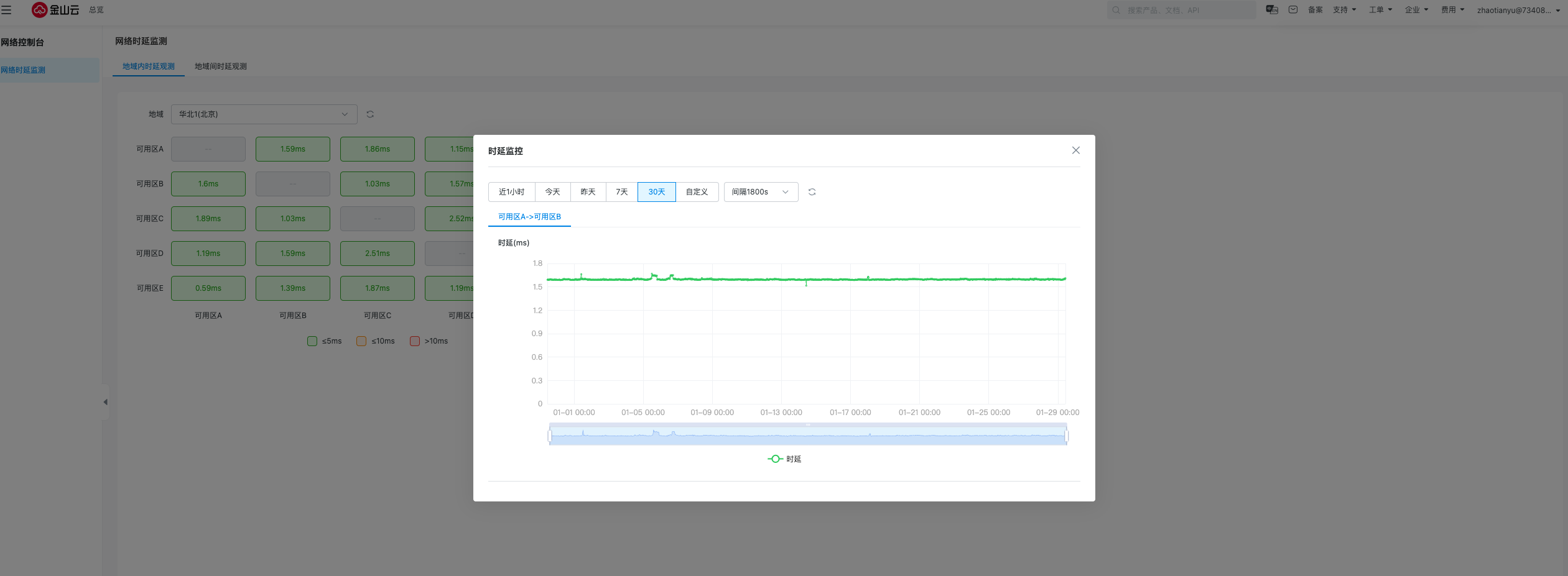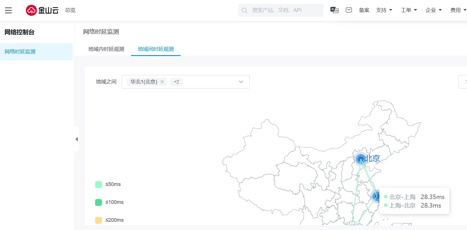 网络时延监测用于查看金山云支持的地域间以及地域内可用区间的内网延时情况,以便您实时了解网络性能,更好规划云上资源分布。