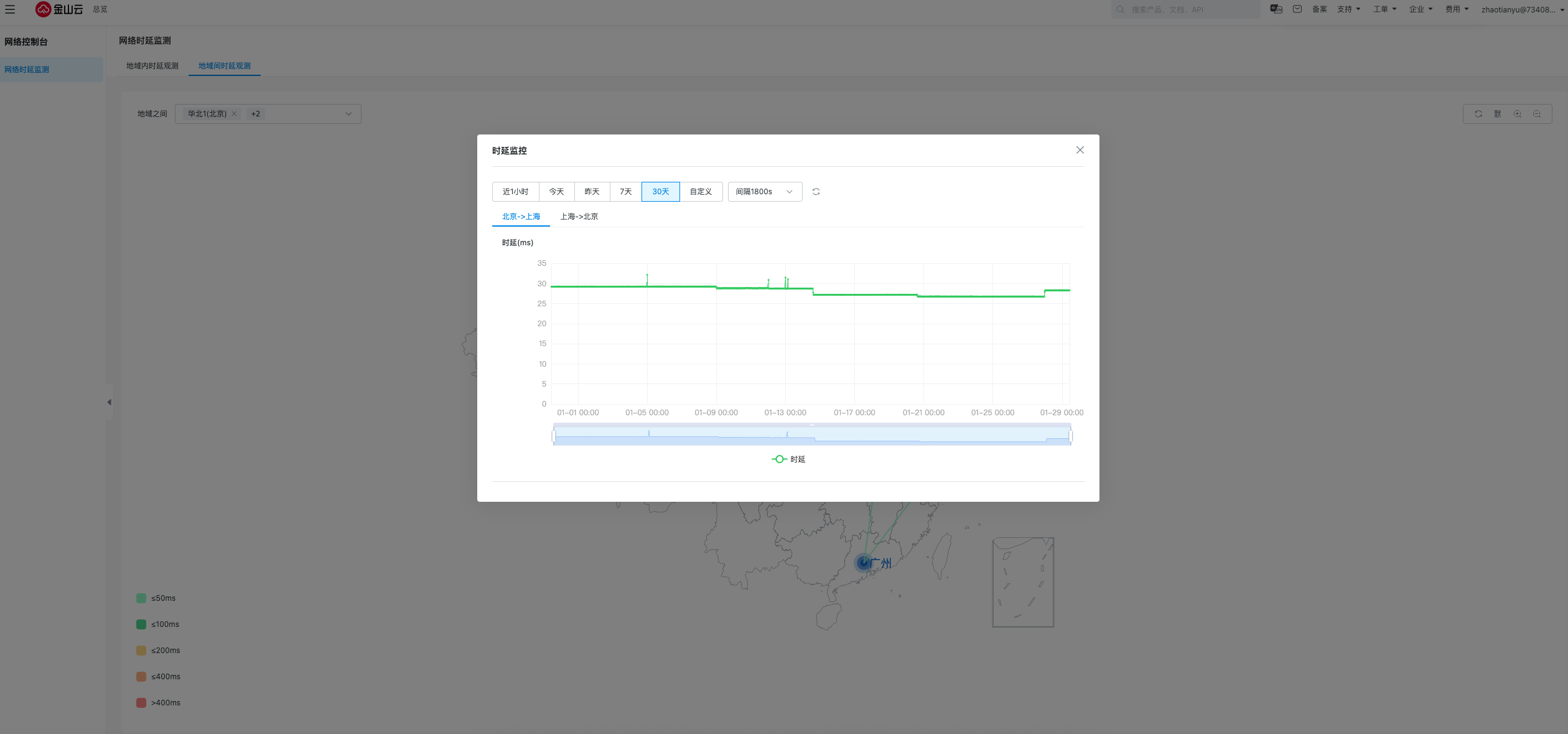 点击颜色线即可查看一定时间内两端的时延监控,最长支持 1 个月的数据。