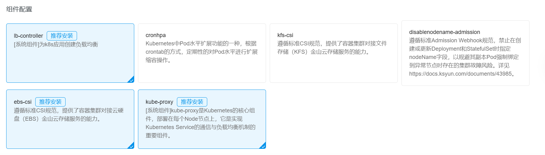 选择组件:根据需求选择要安装的组件,目前支持lb-controller、cronhpa、kfs-csi、disablenodename-admission、ebs-csi、kube-proxy。