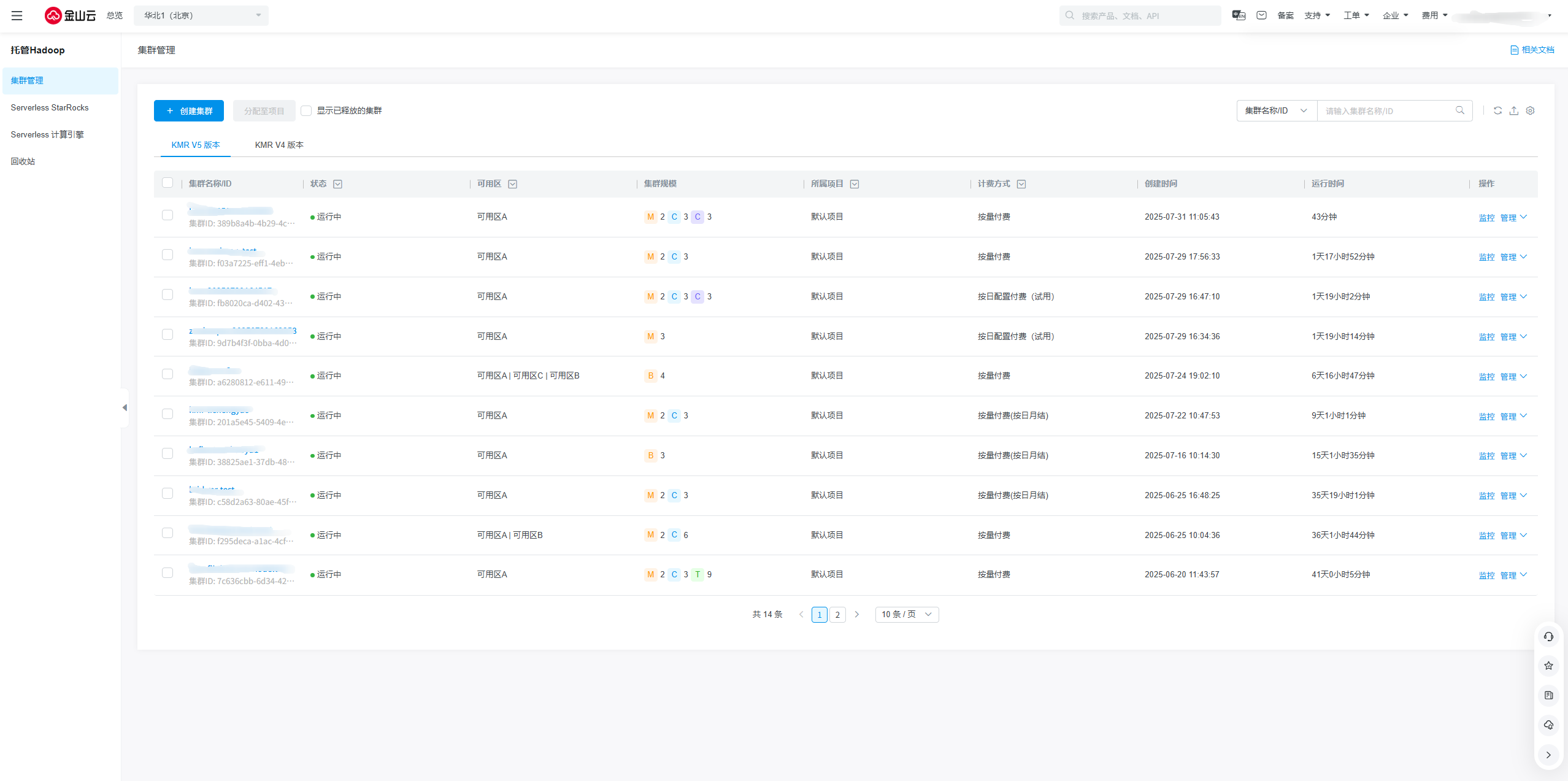 登录金山云托管Hadoop控制台,访问集群管理页面,查看当前所有集群列表。