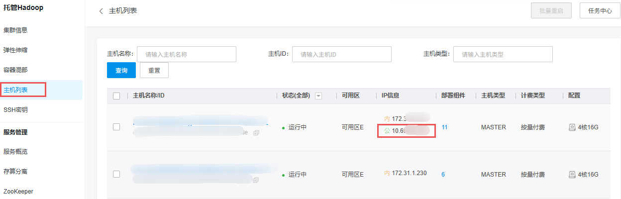 进入目标Kafka集群信息页的“主机列表”侧边栏,IP信息展示主机维度的内网IP信息。