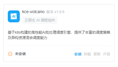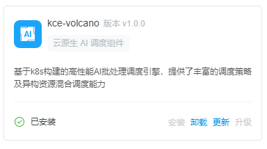 kce-volcano组件安装后,可点击组件右下角 卸载,卸载kce-volcano组件。需注意:卸载kce-volcano后,相关工作负载及关联资源会被同时删除,请谨慎操作!