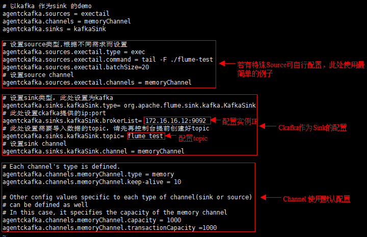 编写配置文件 flume-kafka-sink.properties,以下是一个简单的 Demo(配置在解压目录的 conf 文件夹下),若无特殊要求则将自己的集群 IP 与 Topic 替换到配置文件当中即可。本例使用的 source 为 tail -F flume-test ,即文件中新增的信息。