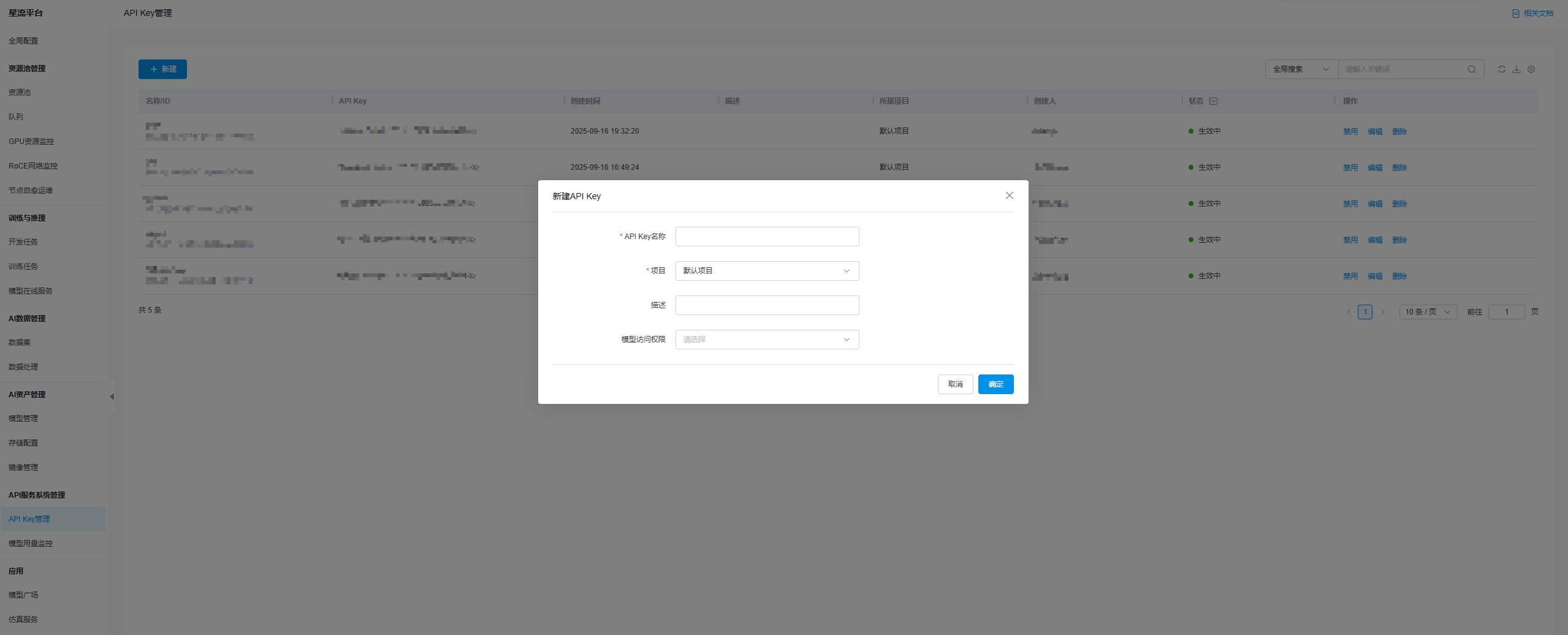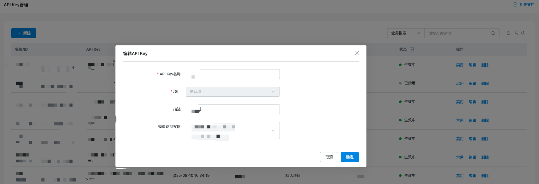 编辑 | 支持对API Key的名称、所属项目、描述及模型访问权限进行修改。 |