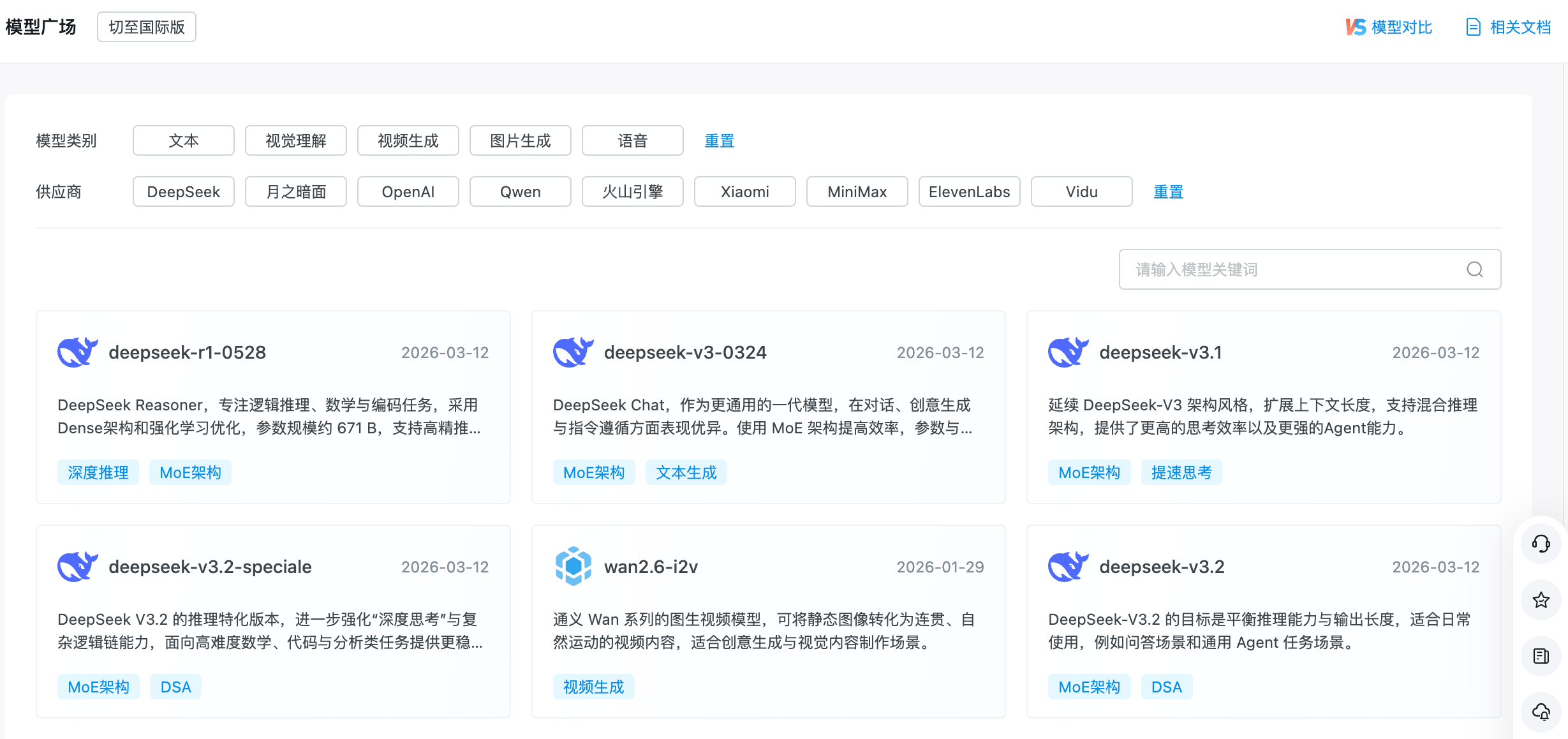 在左侧导航栏,选择模型广场,即可查看当前平台上的大模型列表。当前列表支持按照模型类别、供应商进行筛选。