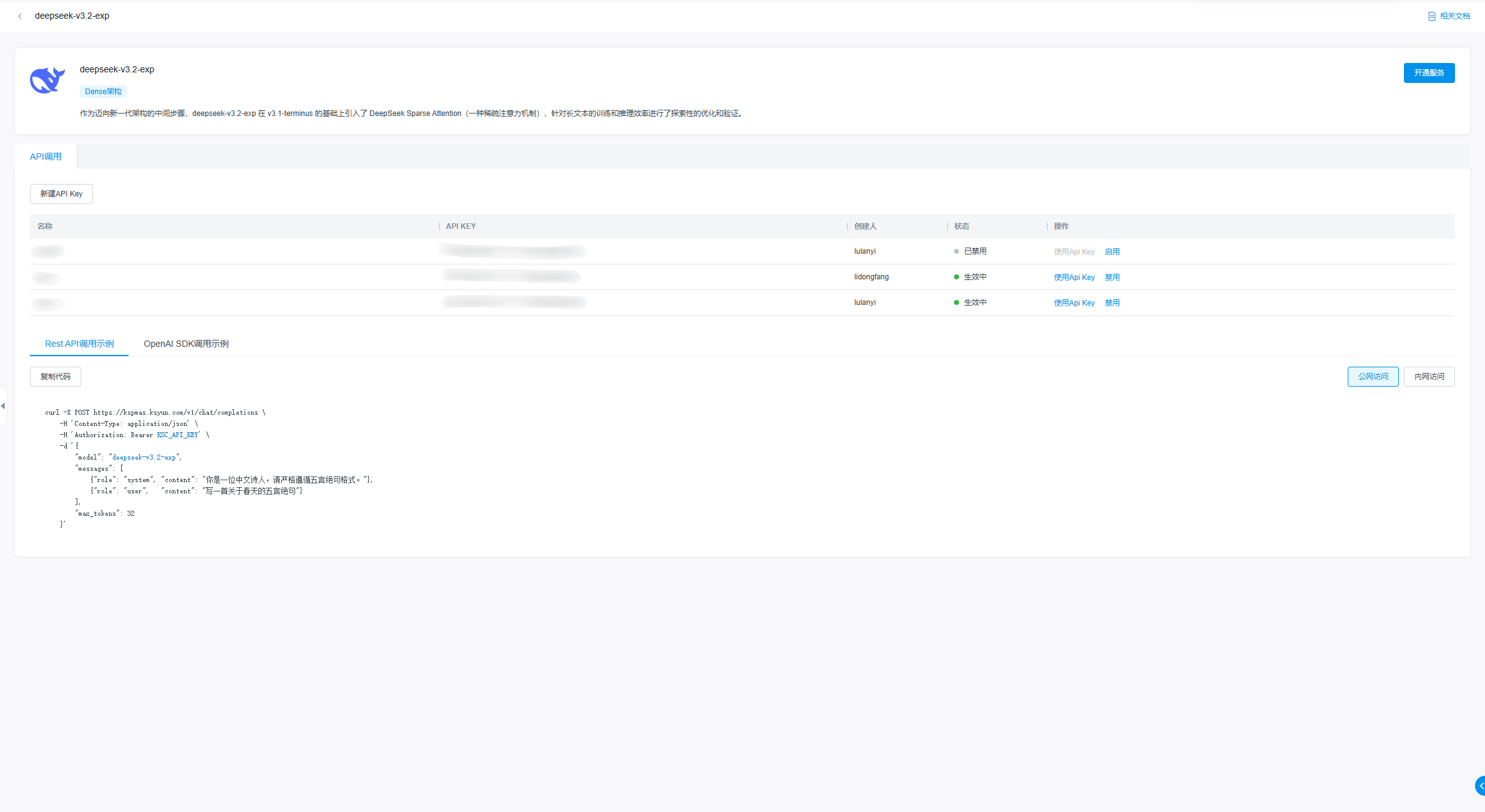 如有可使用的API Key,点击对应使用按钮将此Key自动填充至示例调用代码中。您可在示例调用代码右上角选择内网访问或公网访问示例代码。
