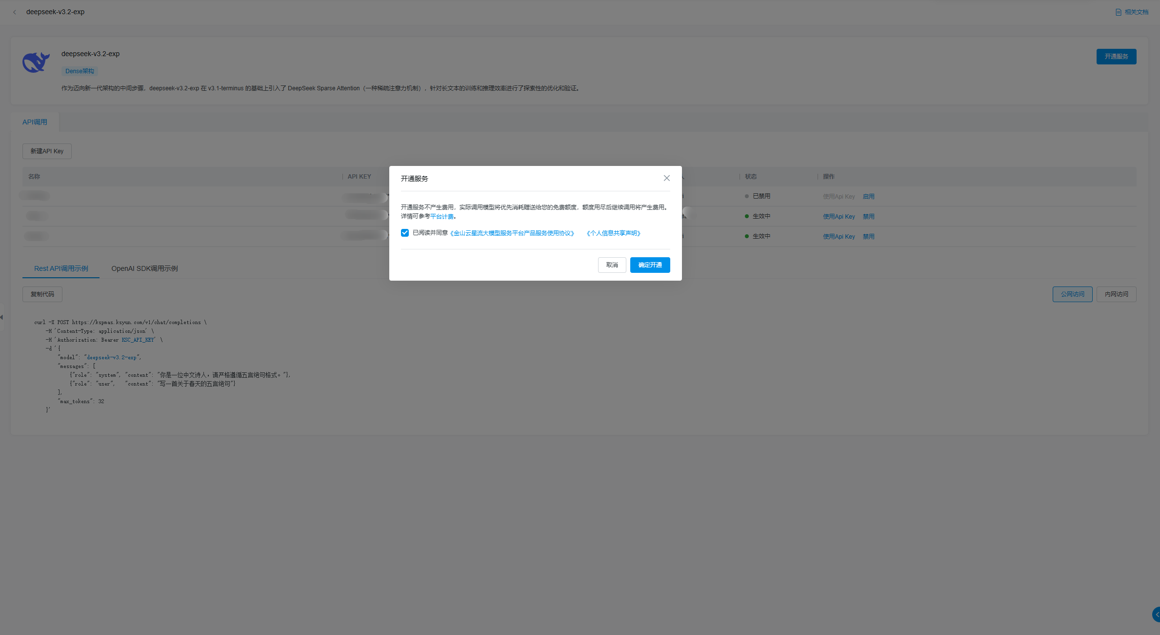 点击API调用按钮可进入对应模型的详情页。您访问尚未开通模型的详情页时,系统将会提示您进行此模型的开通操作。如您不慎关闭了开通页面,在模型详情页您可点击开通按钮或前往额度和开通管理页面进行开通。详情页顶部可查看模型的基本信息,包括模型名称、模型标签、模型描述。您可在本页查看所有可使用的API Key。