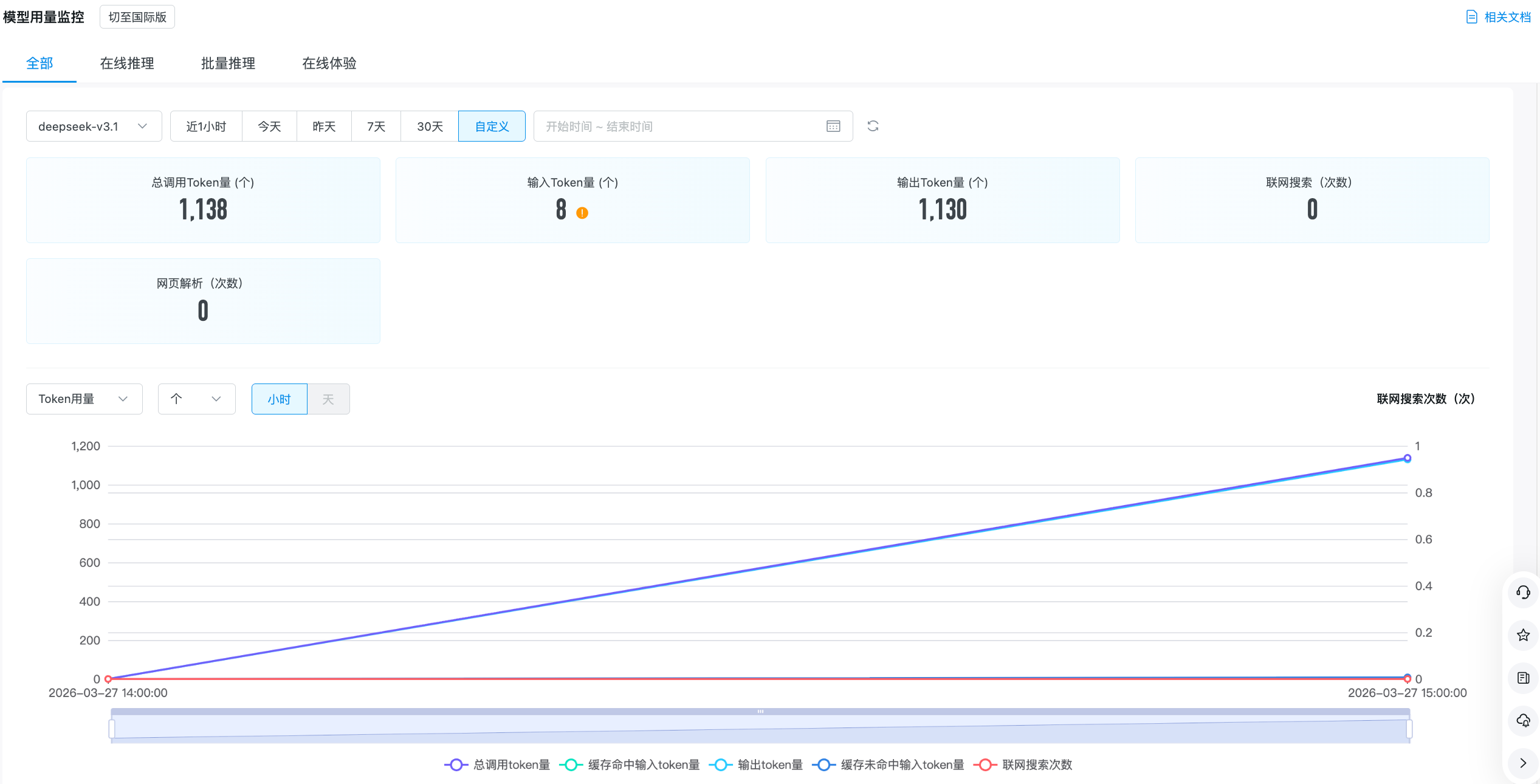 模型用量监控功能,为您提供模型当前调用次数(搜索/解析)与Token消耗的统计视图,支持在在线/批量推理与在线体验两种统计维度上,按模型及自定义时间段筛选查询监控信息。