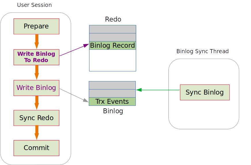 为了提高事务提交效率,KingSQL开发了Binlog in Redo特性,概括来说把 Binlog 转成一种 Redo Type,在事务提交时有序的将Binlog内容同步写入到Redo Log中: