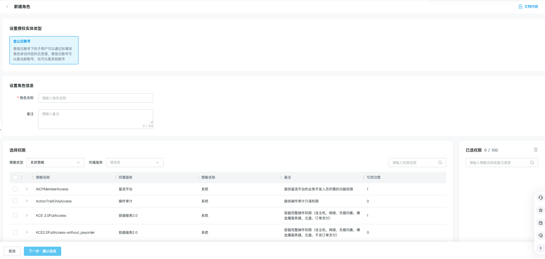 您可点击列表左上方的“新建”按钮,进入角色创建页面,在输入角色名称后您可勾选需要的权限策略们。