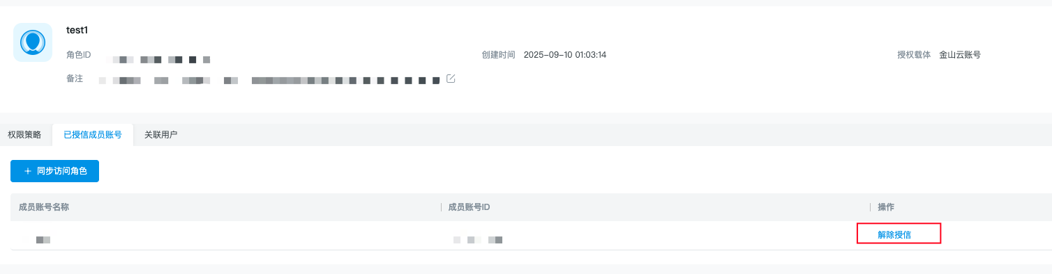 您可点击列表角色名称进入详情页面,您可切换至“已授信成员账号”查看当前角色已授信成员账号的信息,也可在此解绑当前角色和成员账号的关联关系。