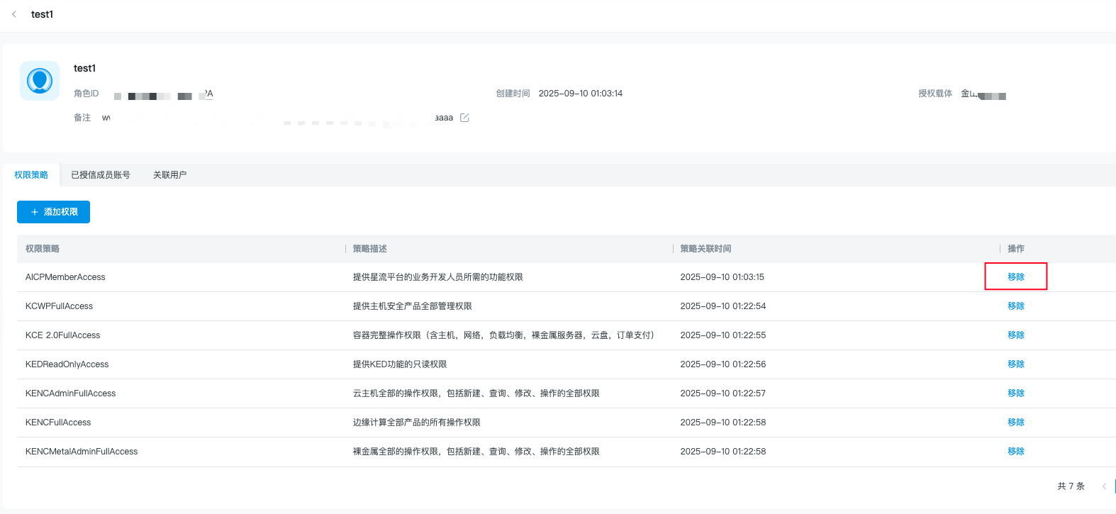 2.进入详情页面后,点击权限策略列表的‘移除’按钮 |