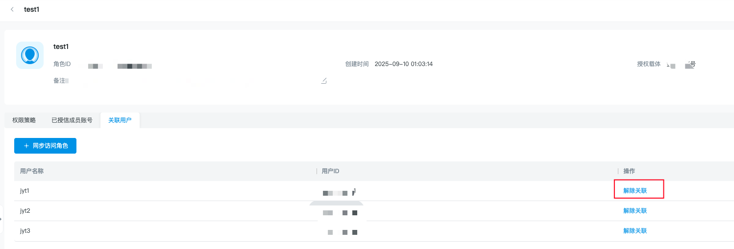 若您需要成员账号下同名角色的权限不同,您可先前往解除当前角色和对应成员账号的绑定关系,然后面向成员账号新建角色。