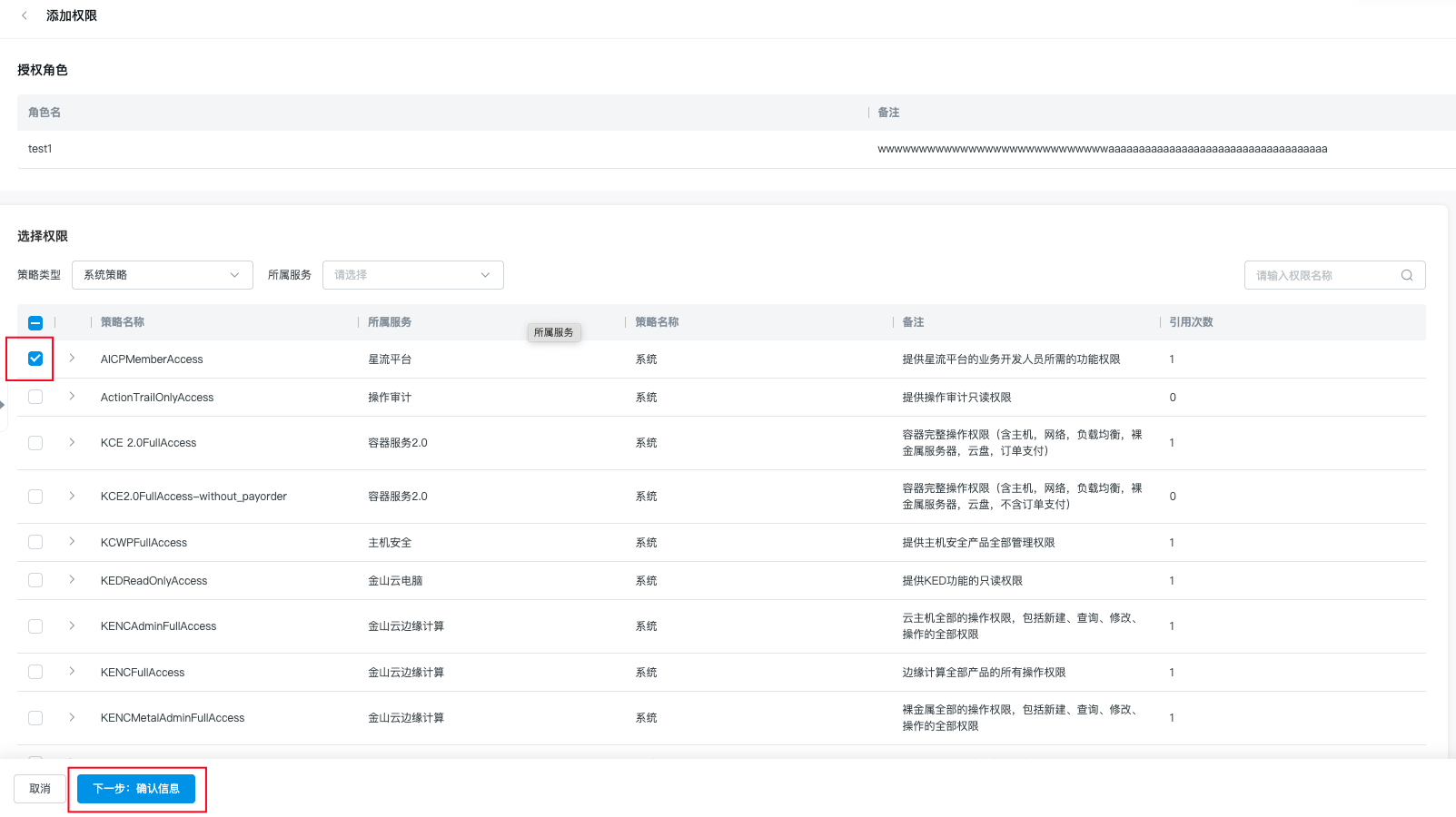 移除策略 | 1.您可点击角色名称进入角色详情页面 | |