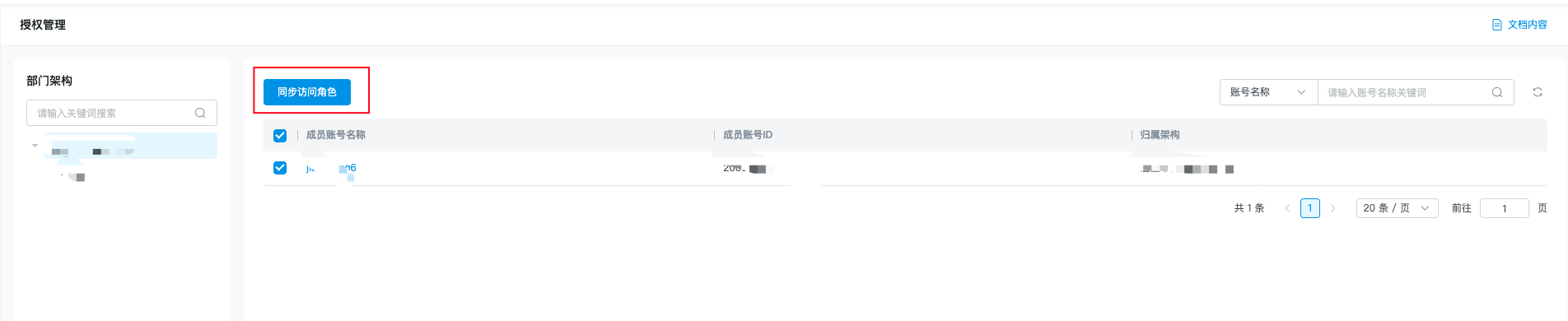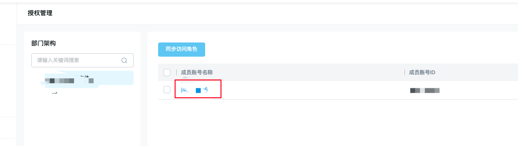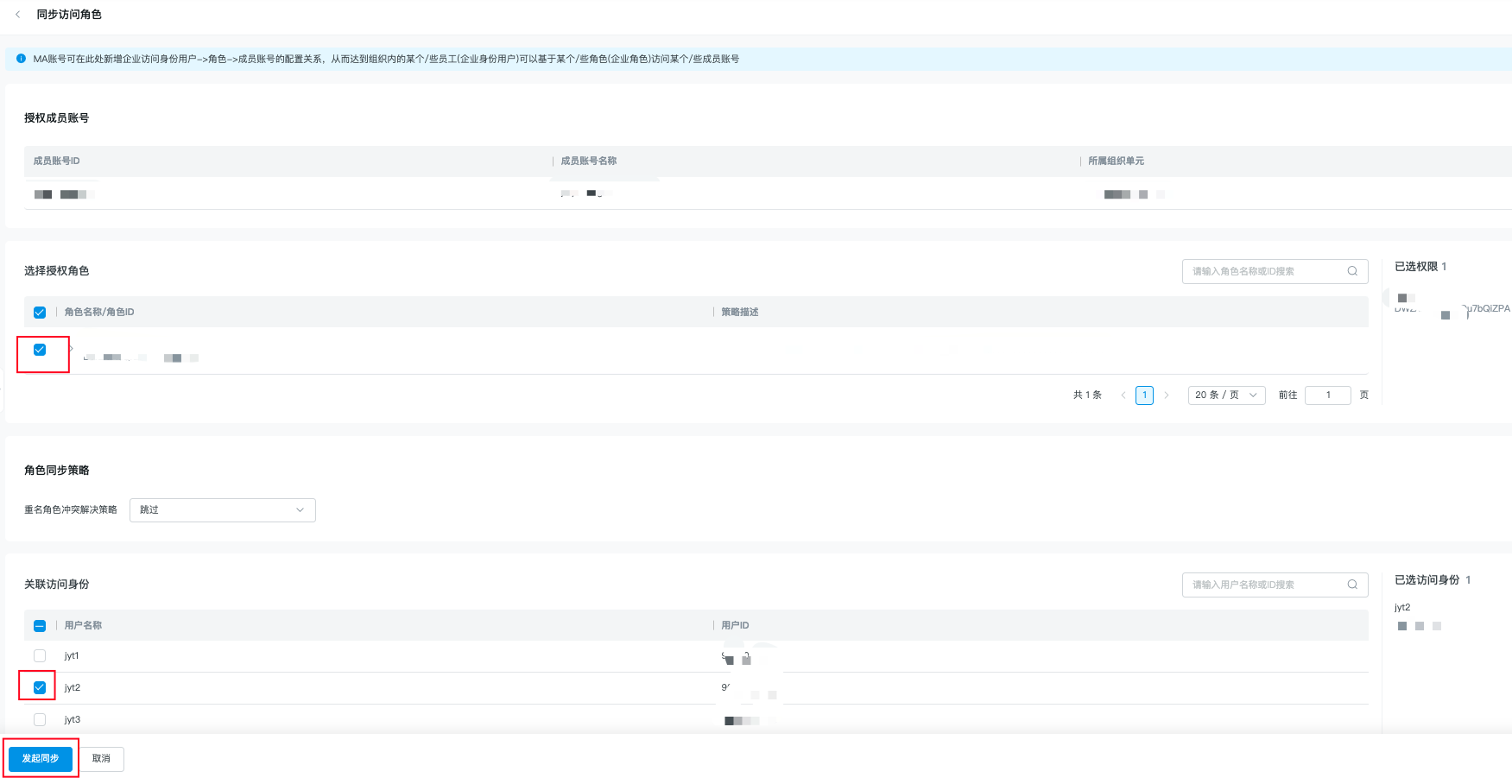 1.选中预期的成员账号,点击‘同步访问角色’按钮,进入配置页面