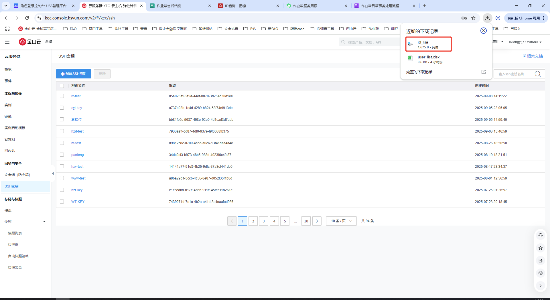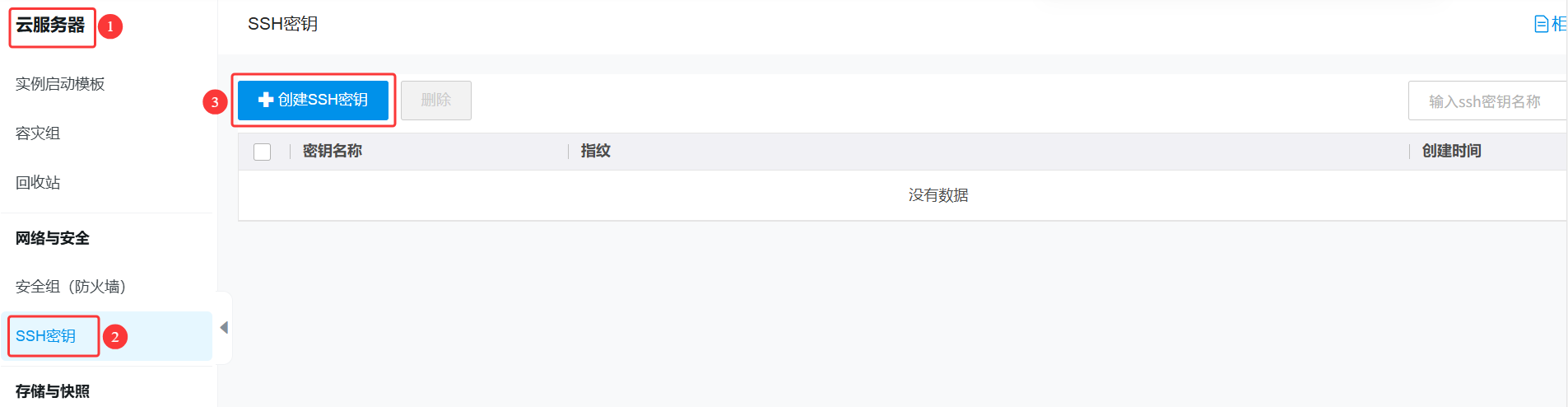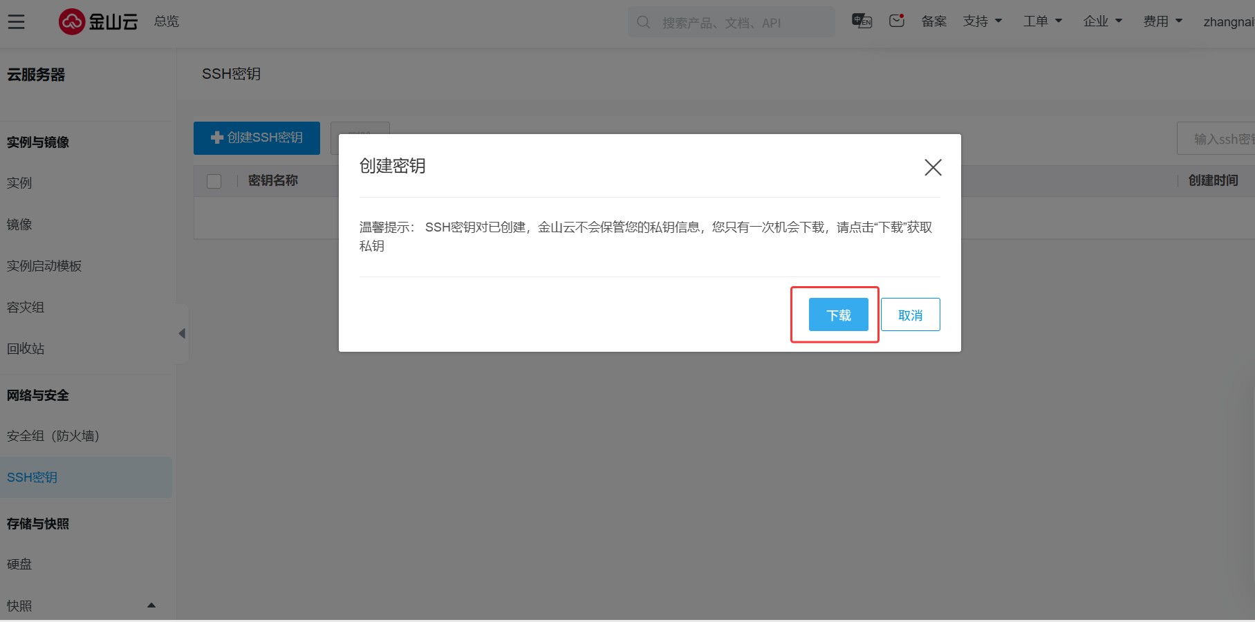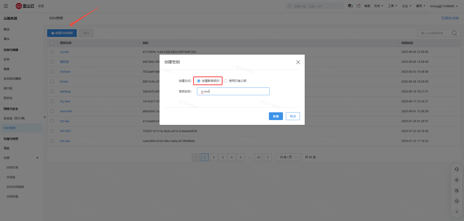 登录金山云控制台 → 选择 云服务器服务 → 进入SSH密钥页面 →新建SSH密钥。