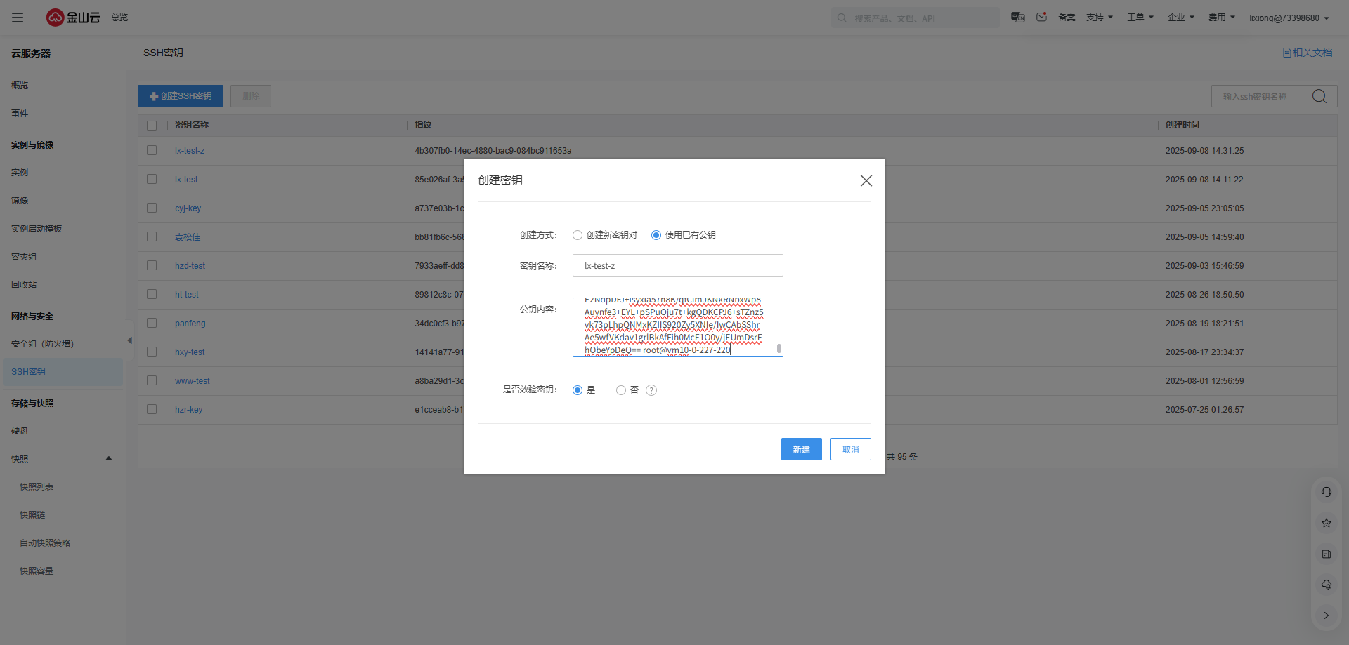 创建方式选择 使用已有公钥,填写密钥名称和公钥内容,“是否效验密钥”选择 是,完成后点击 新建。
