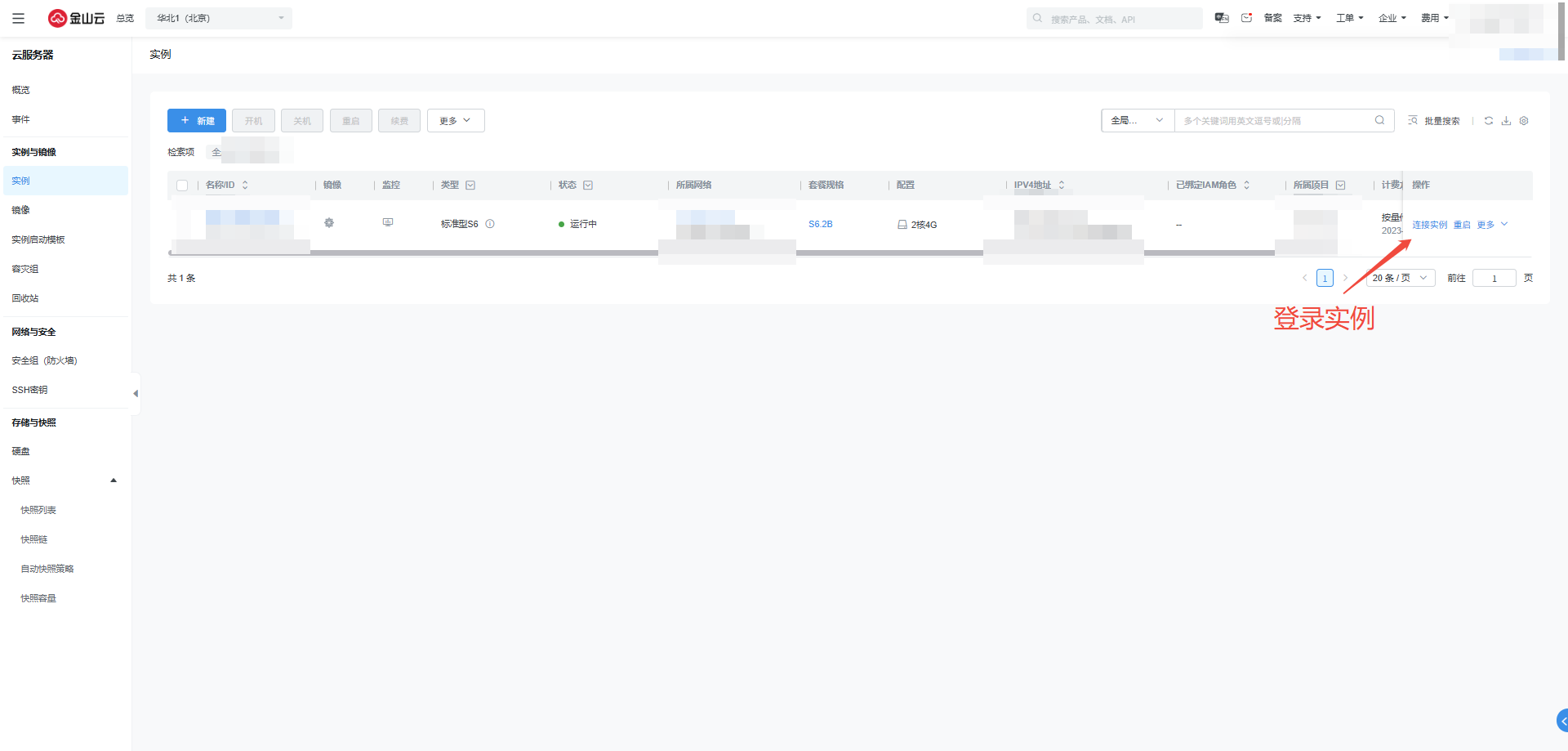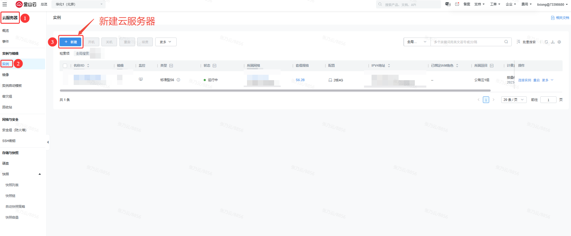 登录金山云控制台 → 选择 云服务器服务 → 进入实例页面 →点击 新建。
