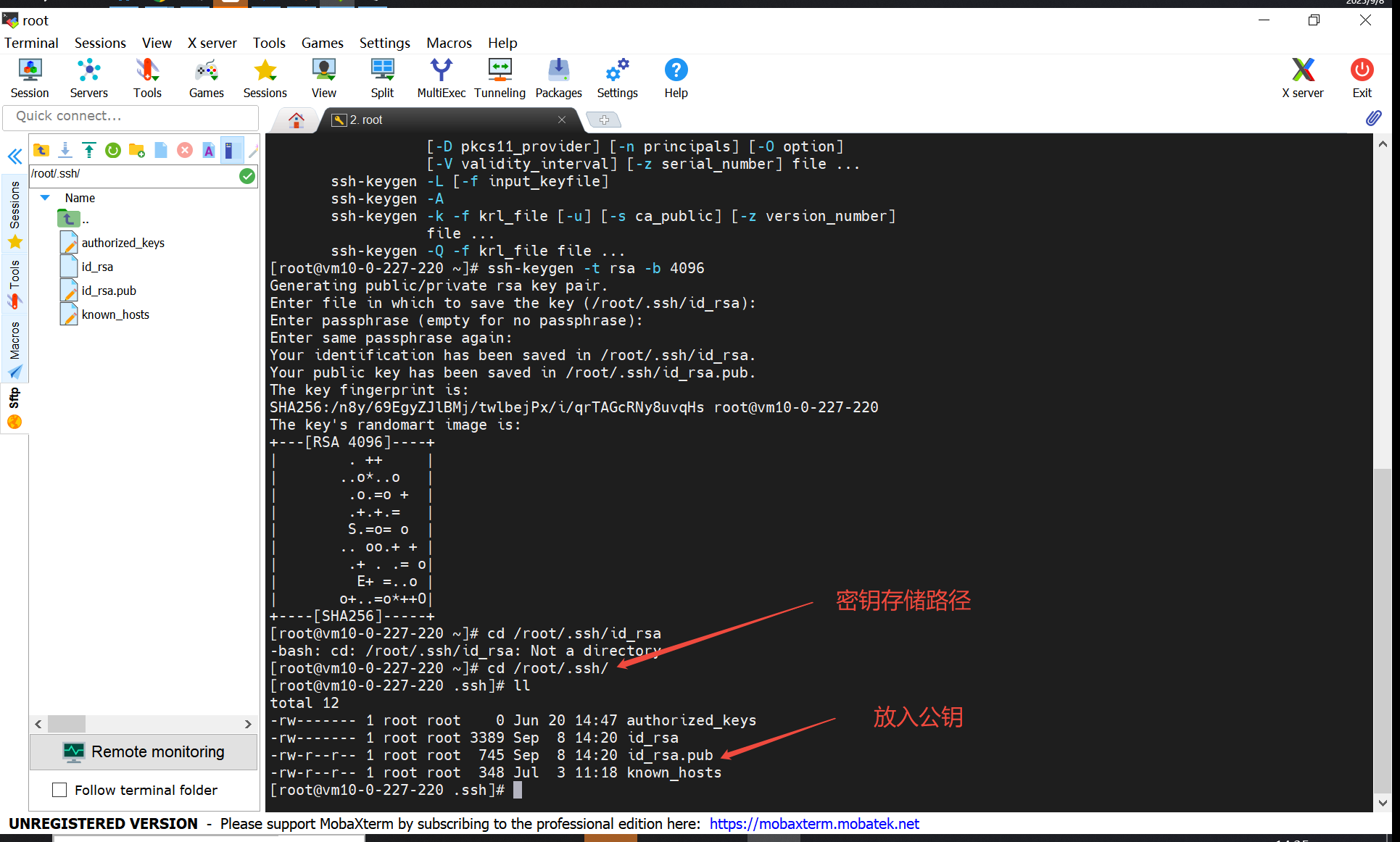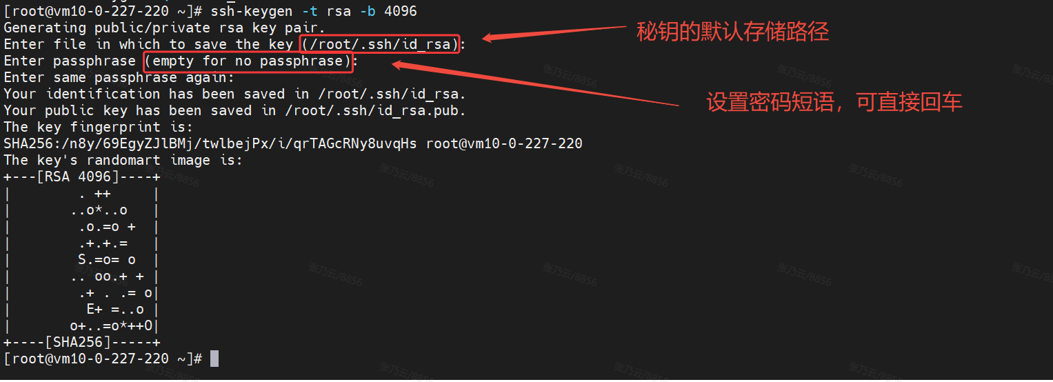 ssh-keygen -t rsa 40963.分别填入密钥的默认存储路径和密码。