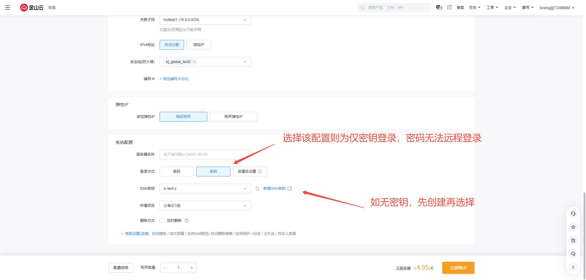2.在系统配置中登录方式选择仅密钥登录,密码无法远程登录。若无密钥,先新建密钥再选择。
