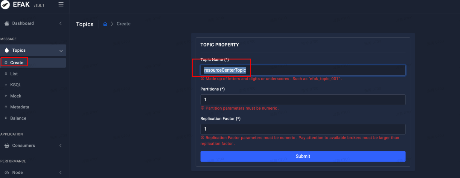 在EFAK管理后台左侧菜单选择Topics,下拉选择Create。