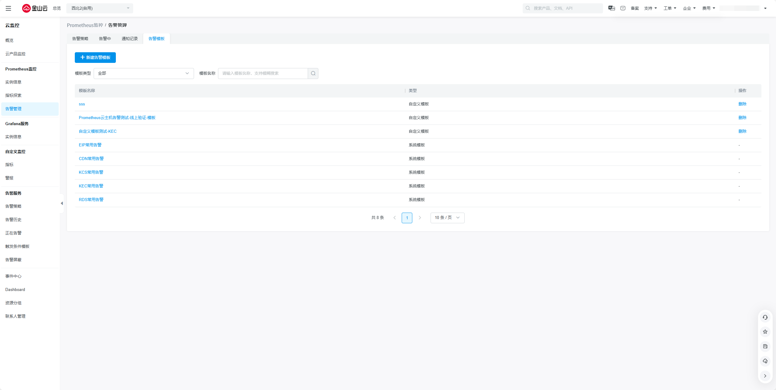系统模板:云监控产品预定义的模板,用户无法编辑。目前云监控预置了5类常用告警,包括:EIP常用告警、CDN常用告警、KCS常用告警、KEC常用告警、RDS常用告警。