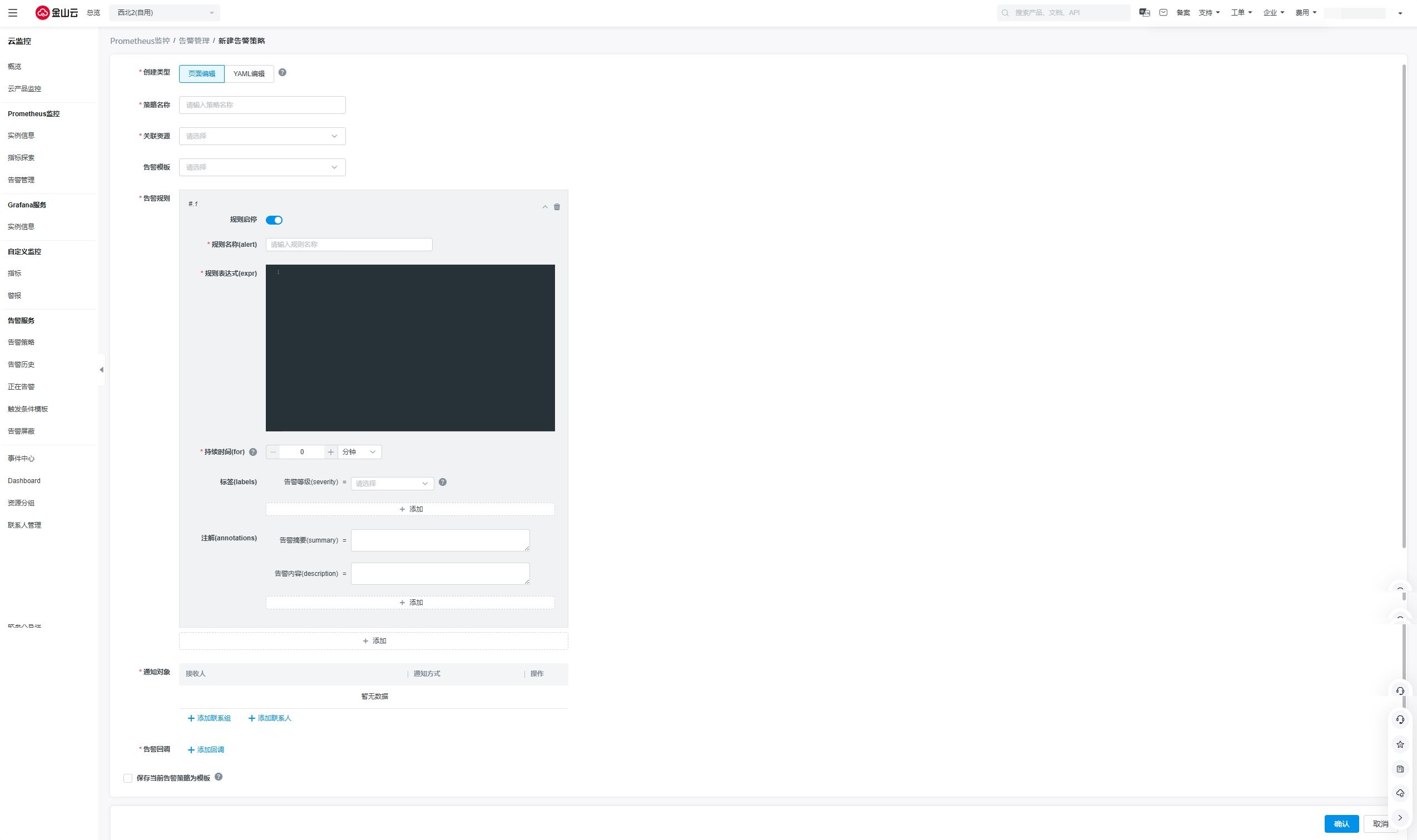 一条告警策略中可以包含一条至多条告警规则。提供两种创建告警规则的方式:页面编辑&YAML编辑。两种方式仅在告警规则填写方式上不同。