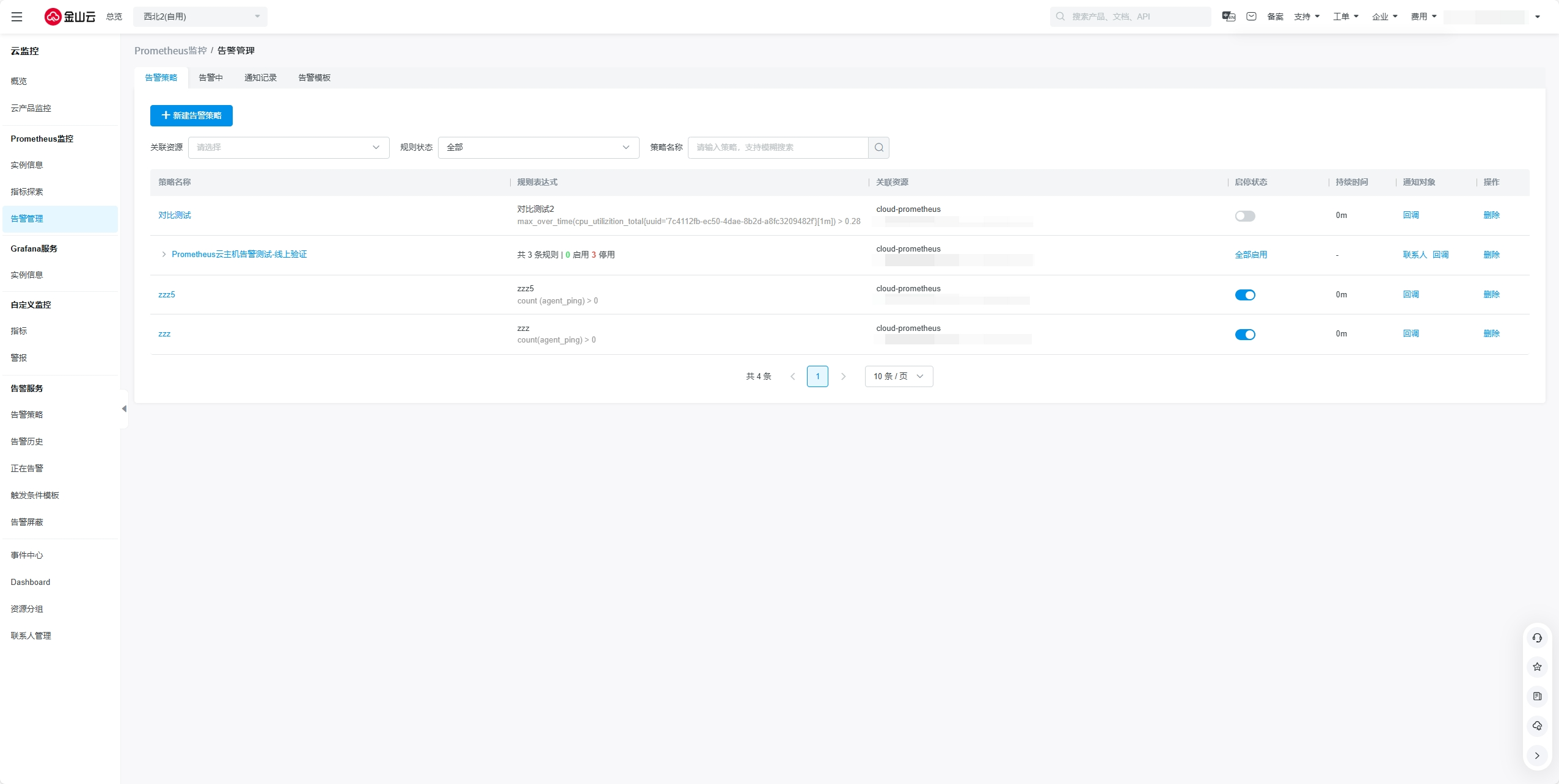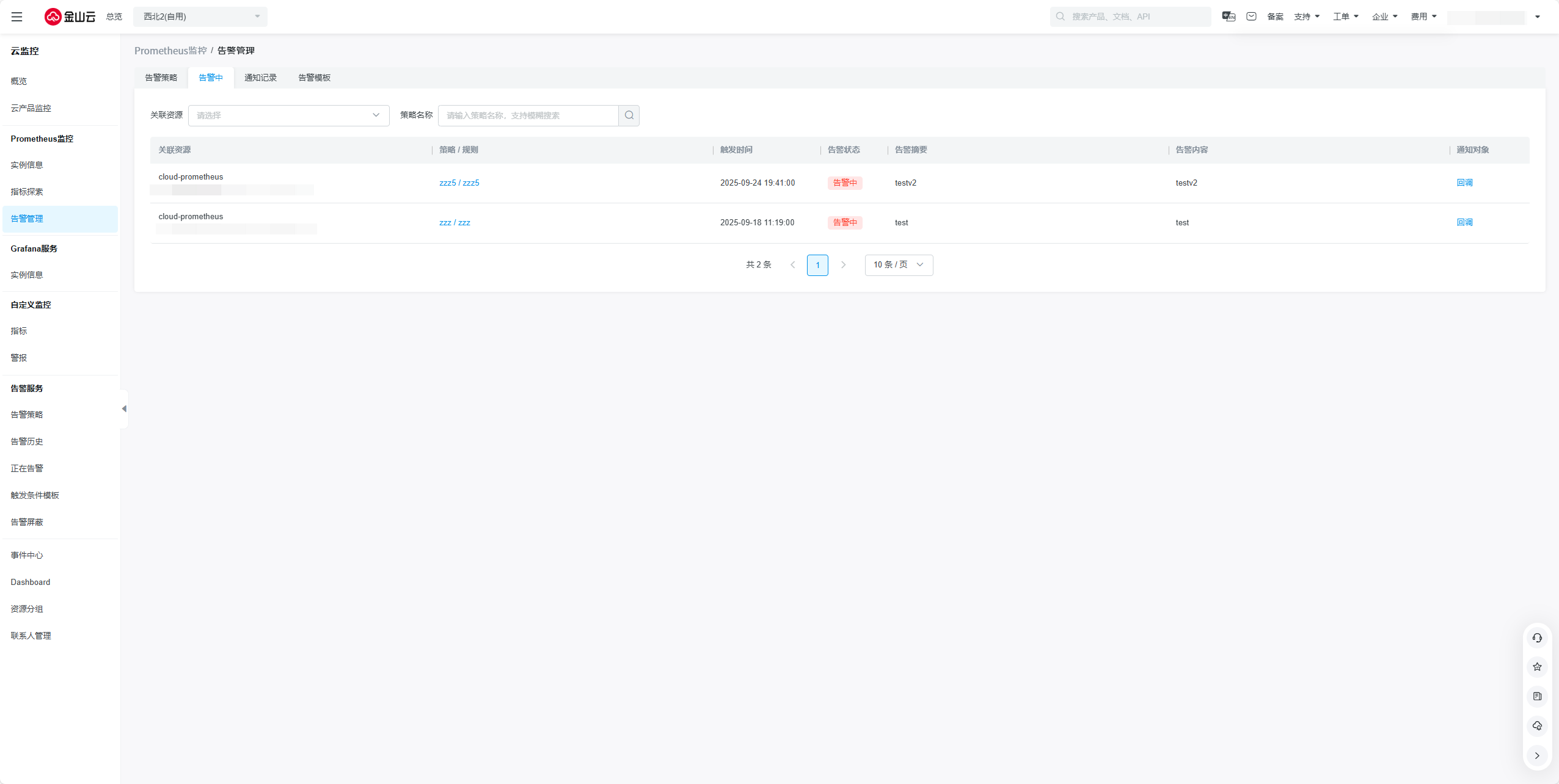 展示当前正在告警的Prometheus告警策略。包括以下信息:关联资源、关联策略/规则、触发时间、告警状态、告警摘要、告警内容、通知对象。