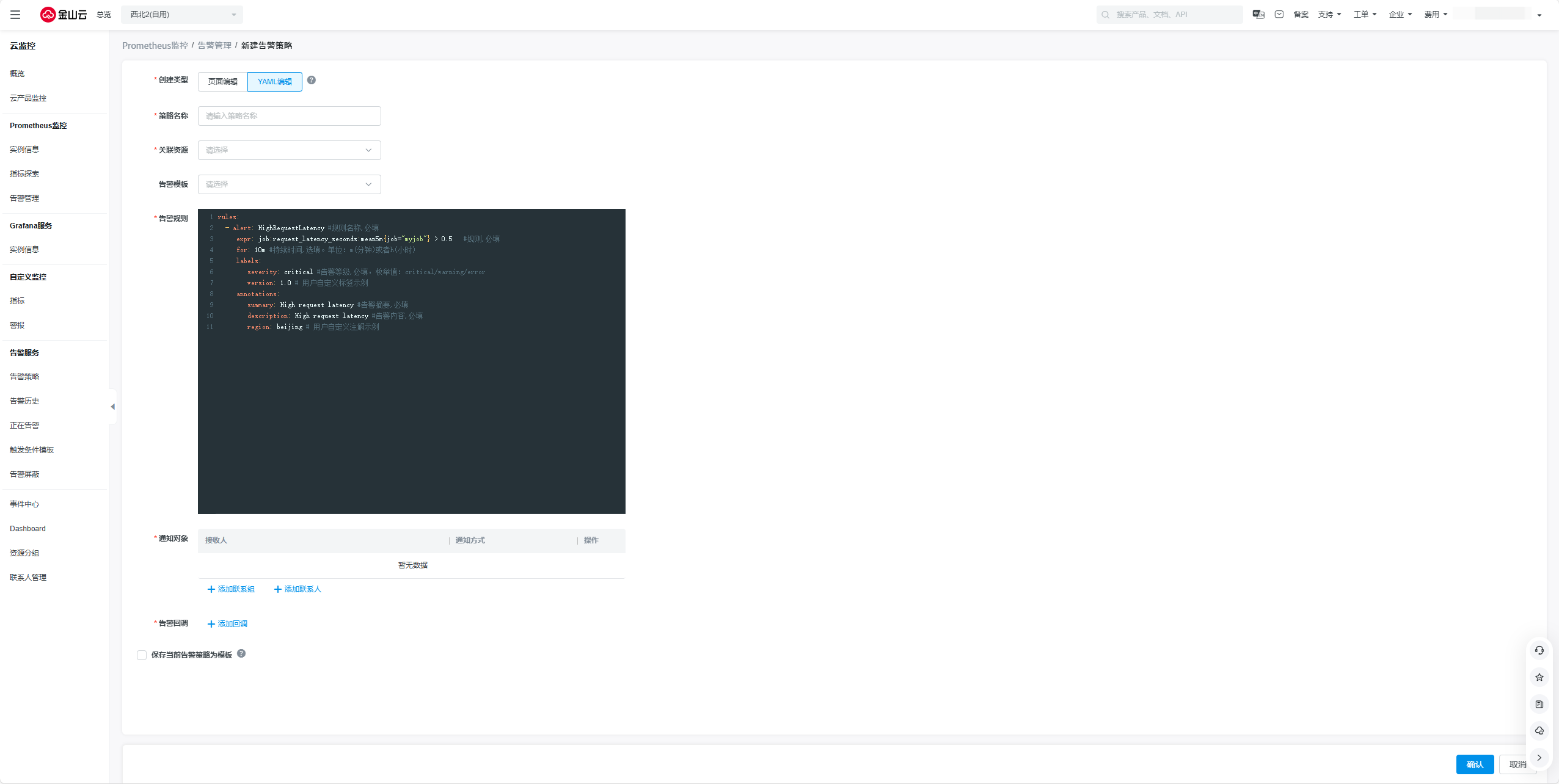 告警规则 | 页面编辑: 可通过按钮控制单条规则的启用/停用。 分别输入规则名称、规则表达式、持续时间、标签、注释。 标签中,告警等级字段必填,枚举值有:critical、error、warning。 注释中,告警摘要&告警内容信息必填。 YAML编辑: 直接使用YAML格式编辑告警规则。 |