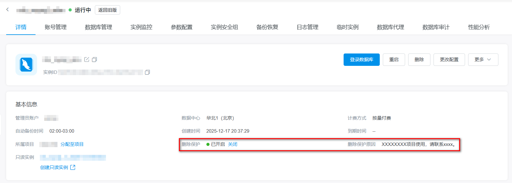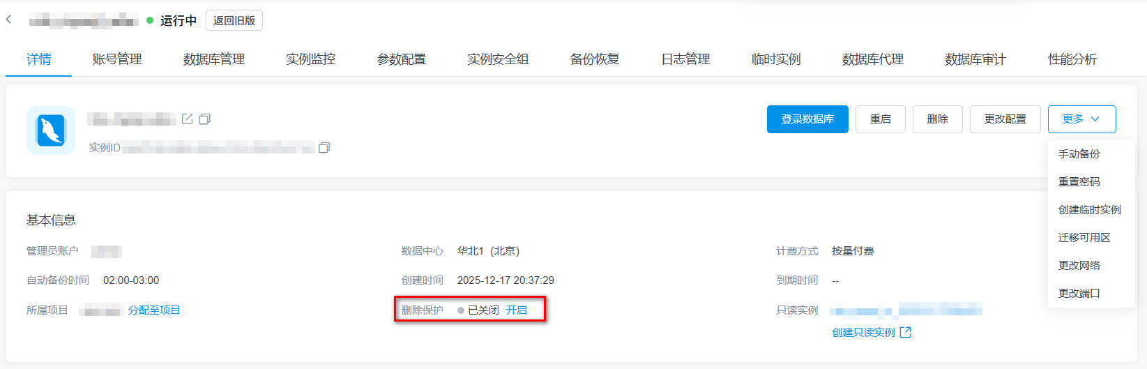 实例开启删除保护后,无法通过控制台或API删除实例,可减少误删除实例操作的情况发生。关闭删除保护后,方可通过控制台或API删除实例。