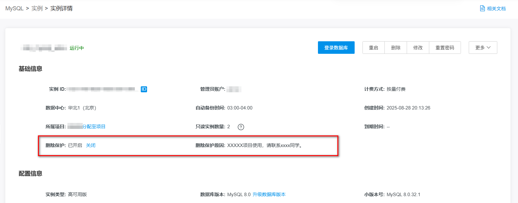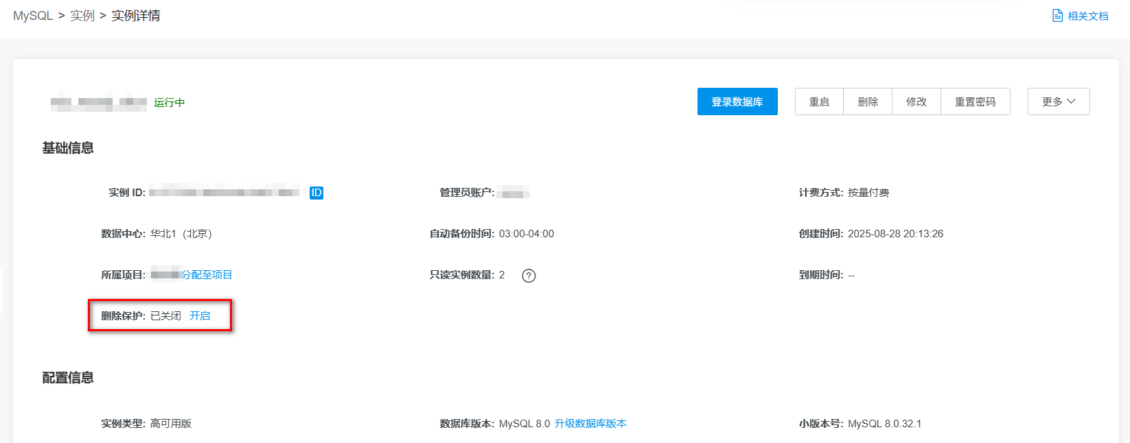 实例开启删除保护后,无法通过控制台或API删除实例,可减少误删除实例操作的情况发生。关闭删除保护后,方可通过控制台或API删除实例。
