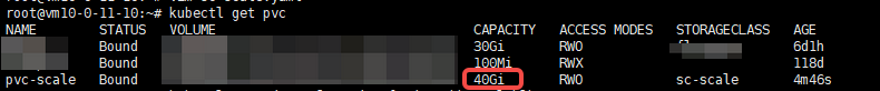 从上图可以看出,CAPACITY列的数据已经变为40Gi,表示磁盘已经扩容成功。