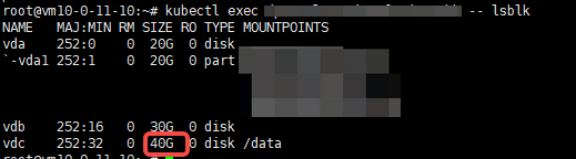 从上图可以看出,目标挂载路径的磁盘大小已变为40G,表示扩容后的磁盘已成功挂载至Pod。