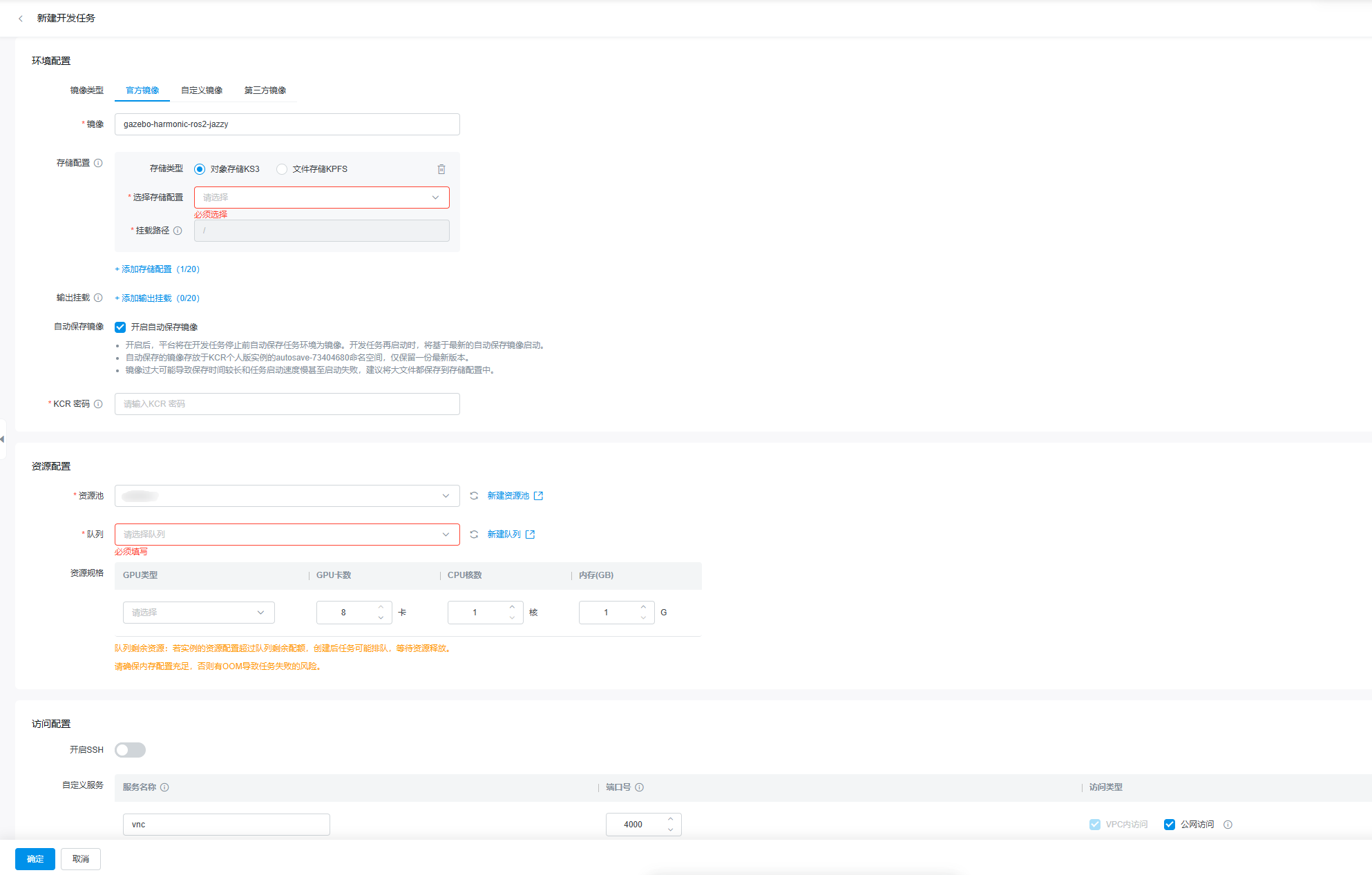 9.新建开发任务,选择仿真容器镜像(Gazebo请选择gazebo-harmonic-ros2-jazzy镜像,MuJoCo请选择mujoco3.3.4镜像),设置存储配置(可能需要),自定义服务打开4000端口并开启公网访问。宿主机需配置公网EIP,并且安全组出口需要开放IP协议。启动成功后,点击连接,通过web IDE任意方式连接到容器终端即可。