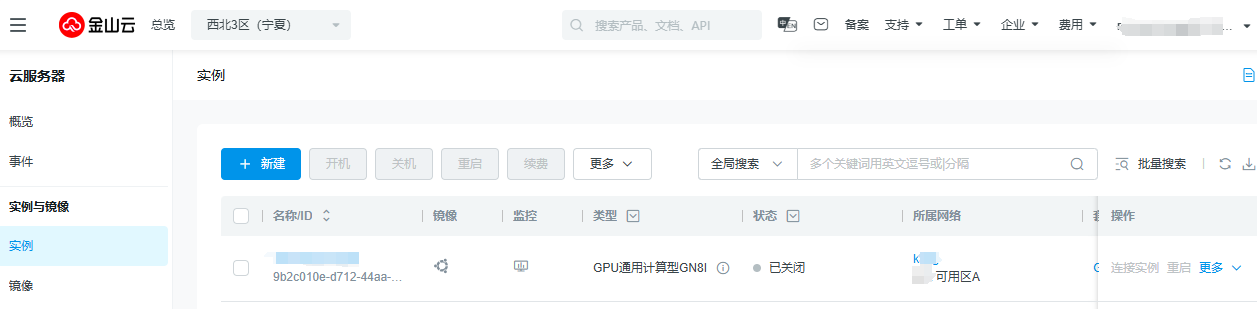 2.在右侧展示界面中,点击+新建,开一台GPU云服务器并关机(仅支持关机状态加入容器集群),选择存储配置时请确保GPU云服务器有足够的硬盘空间