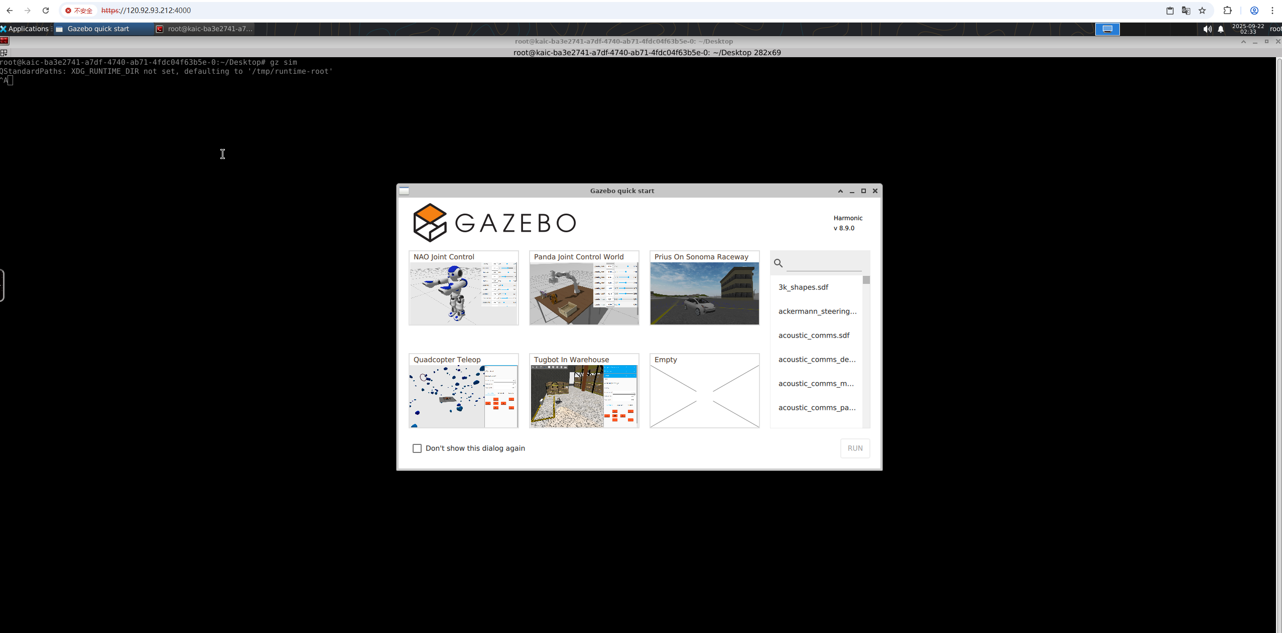1.(选择gazebo-harmonic-ros2-jazzy镜像时)连接Gazebo仿真桌面后,打开终端输入gz sim打开Gazebo客户端。