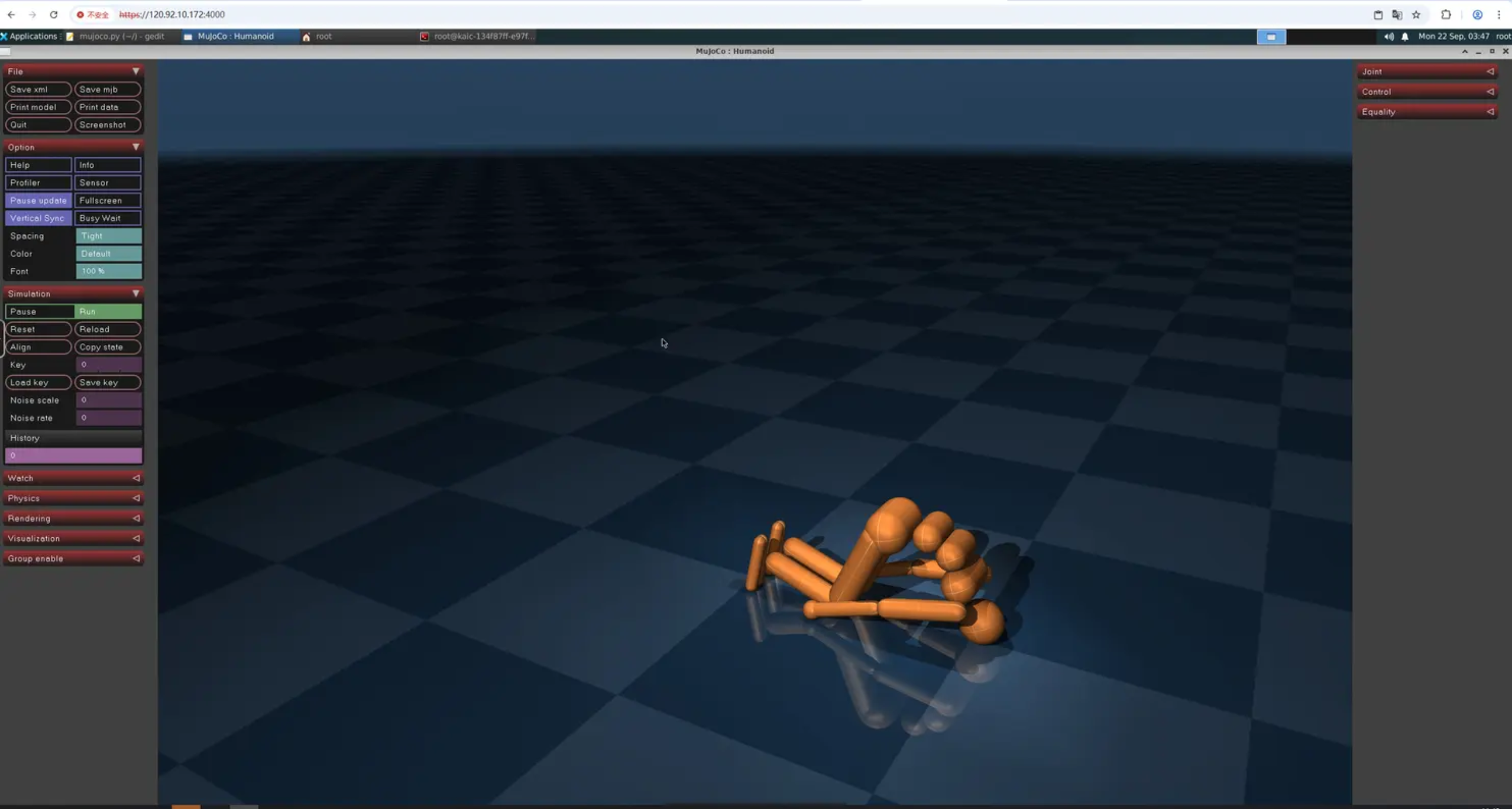 /root/mujoco-3.3.4/bin/simulate /root/mujoco-3.3.4/model/humanoid/humanoid.xml4.运行后会弹出仿真器,此时需要确认以下几点是可用的: