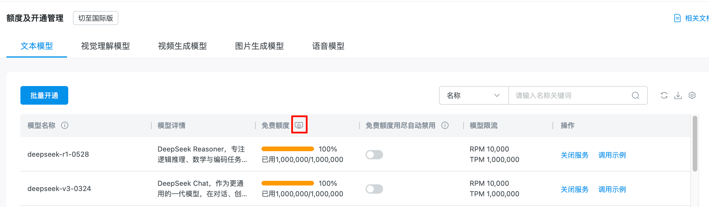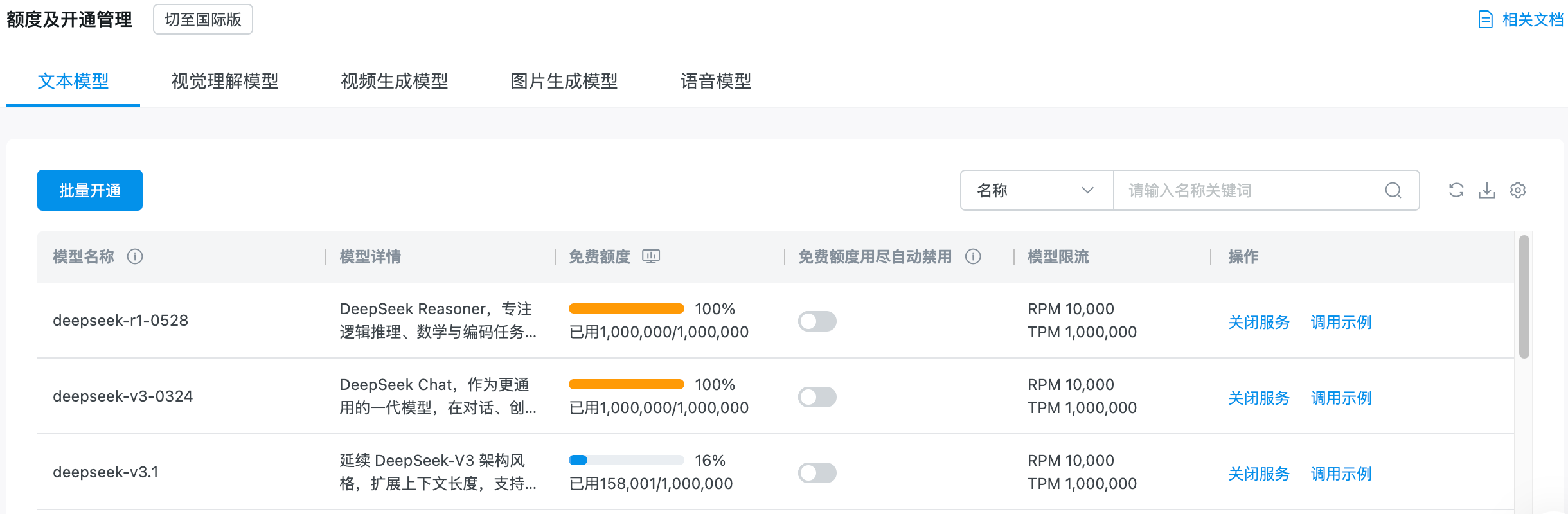 目前文本模型和视觉理解模型提供免费额度,其他类型模型暂不提供免费额度。